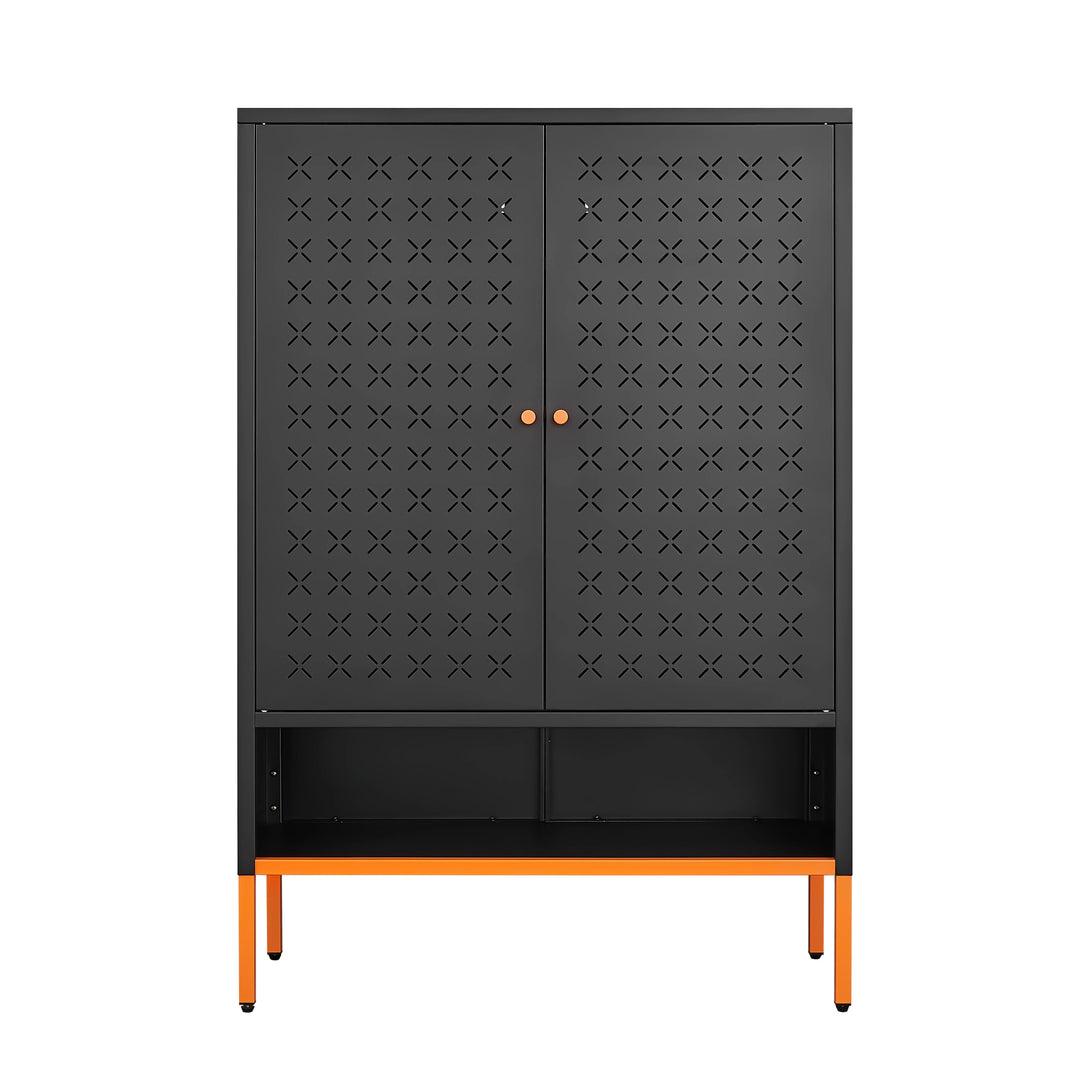 This modern white shoe cabinet features a sleek metal construction with dual-opening butterfly doors for space-efficient access. The design includes three adjustable shelves, offering flexible storage for various footwear types. Its suspended hollow compartment and 15cm elevated base ensure ventilation and moisture protection, while the anti-tip kit meets safety standards. Ideal for entryways or living spaces, this freestanding unit combines minimalist aesthetics with practical functionality.