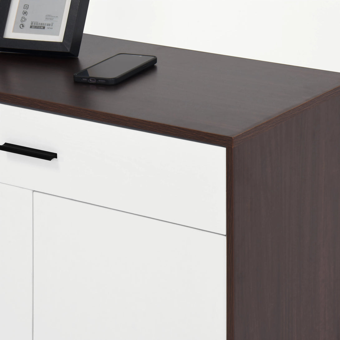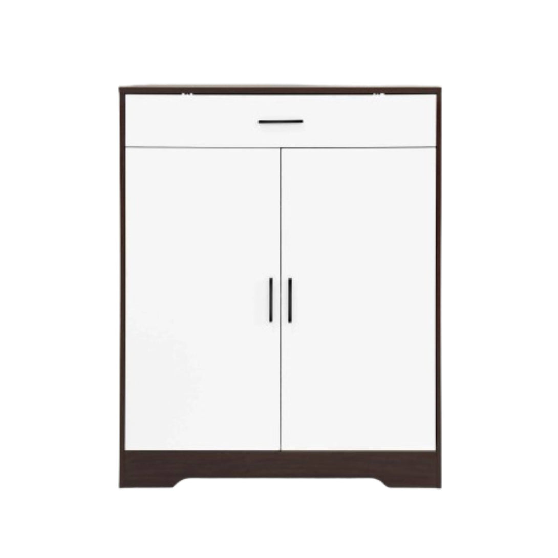 This 4-tier shoe cabinet offers both functionality and style. Crafted from sturdy particle board with low emissions, it features two white doors, adjustable shelves for boots, and a spacious drawer for small items. Each shelf holds 3-4 pairs of shoes, providing ample storage. Its minimalist walnut and white finish blends seamlessly into entryways, hallways, or living spaces. Easy to assemble and freestanding, it maximizes space while keeping your home organized and elegant.