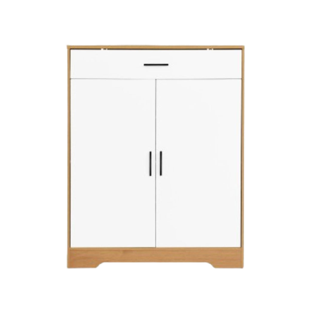 This 4-tier shoe cabinet offers both functionality and style. Crafted from sturdy particle board with low emissions, it features two white doors, adjustable shelves for boots, and a spacious drawer for small items. Each shelf holds 3-4 pairs of shoes, providing ample storage. Its minimalist walnut and white finish blends seamlessly into entryways, hallways, or living spaces. Easy to assemble and freestanding, it maximizes space while keeping your home organized and elegant.