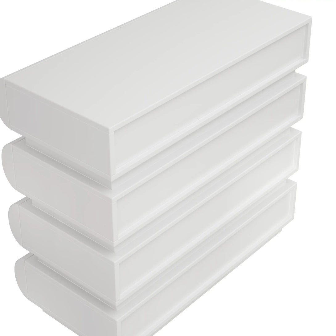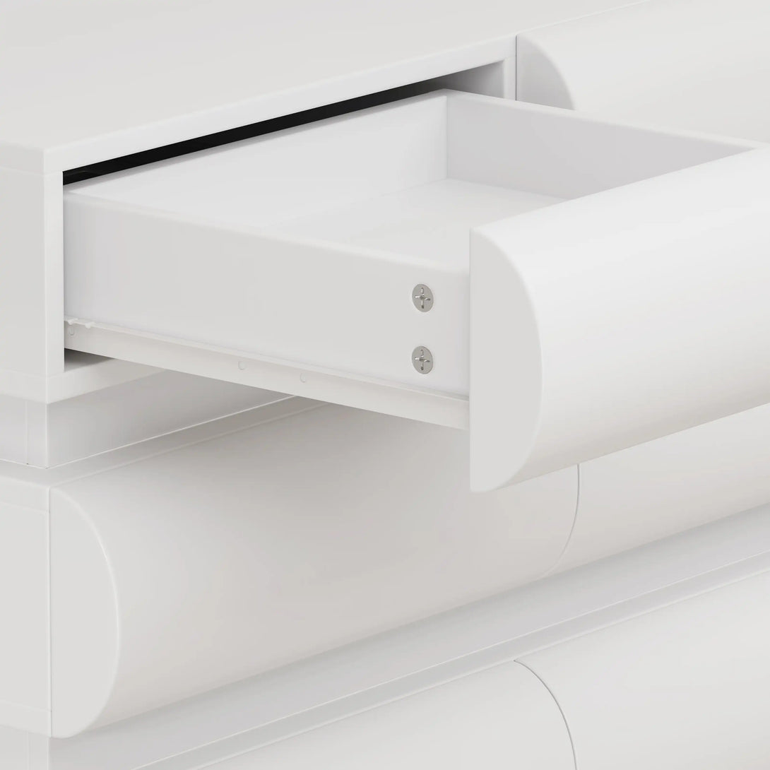 Minimalist Modern Design: Handle-less slide drawers, crisp vertical and horizontal lines, and graceful curved edges.