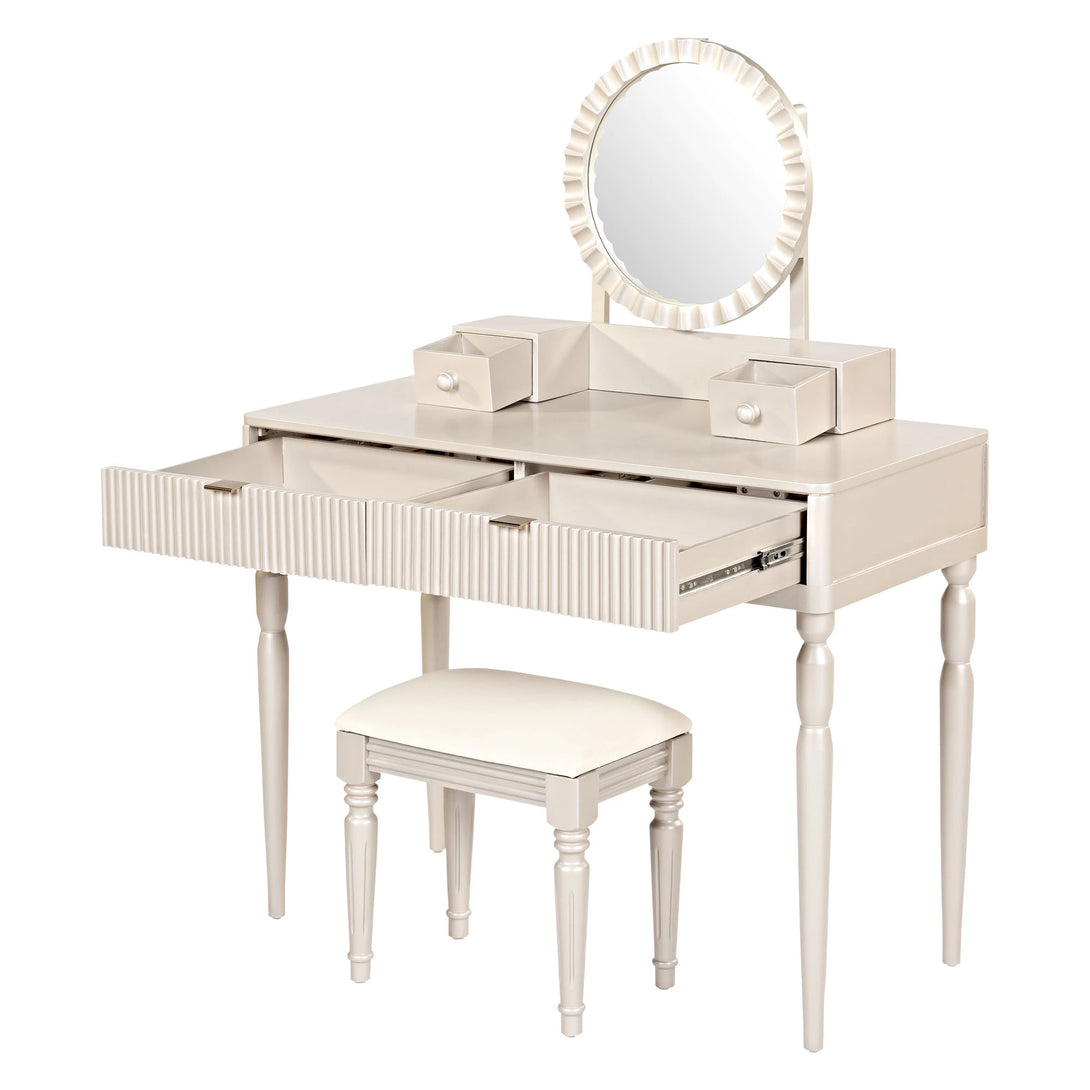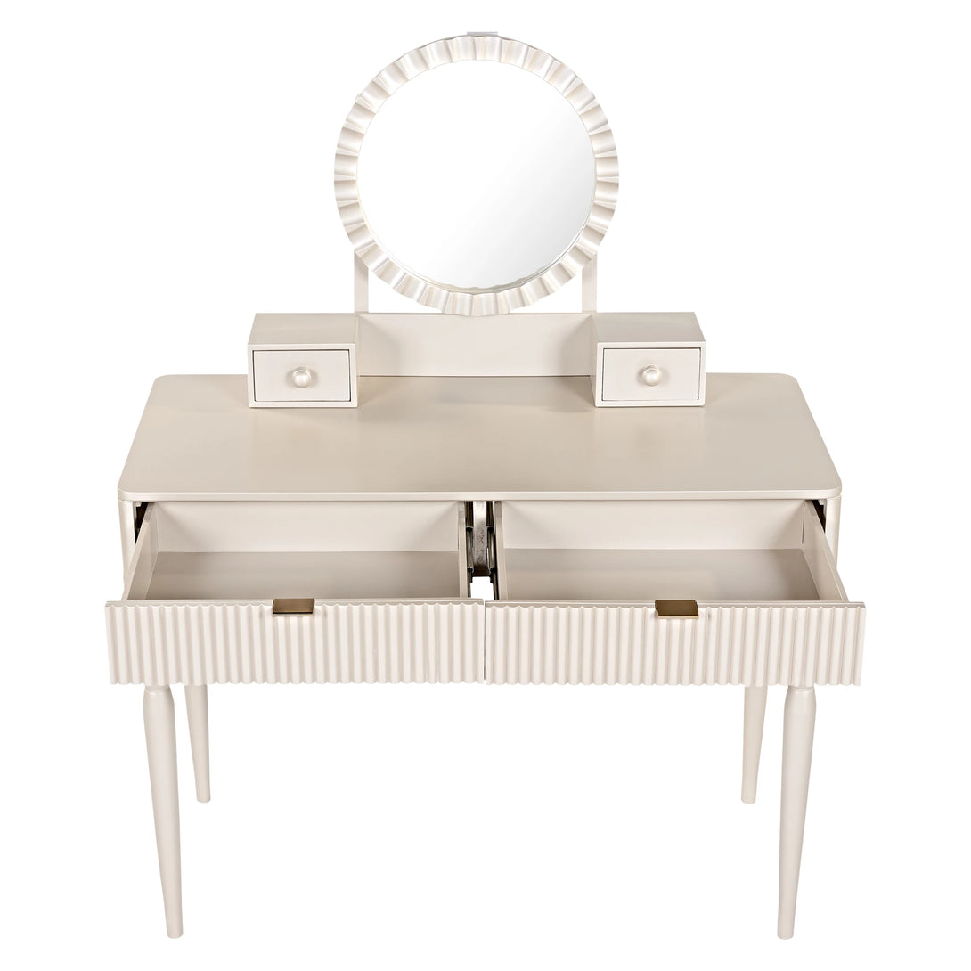 This elegant dressing table features a sunflower-shaped mirror, carved legs, and fluted drawer panels. Crafted from solid and engineered wood with a cushioned PU stool, it offers ample storage with 2 large and 2 small drawers and a spacious tabletop. The mirror can be wall-mounted or freestanding, and assembly is quick and easy. Perfect for bedrooms, it blends classic charm with modern style.