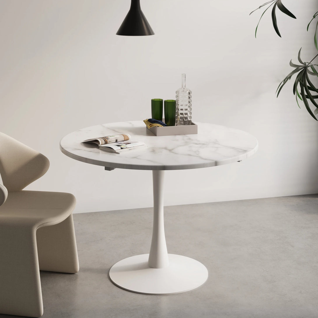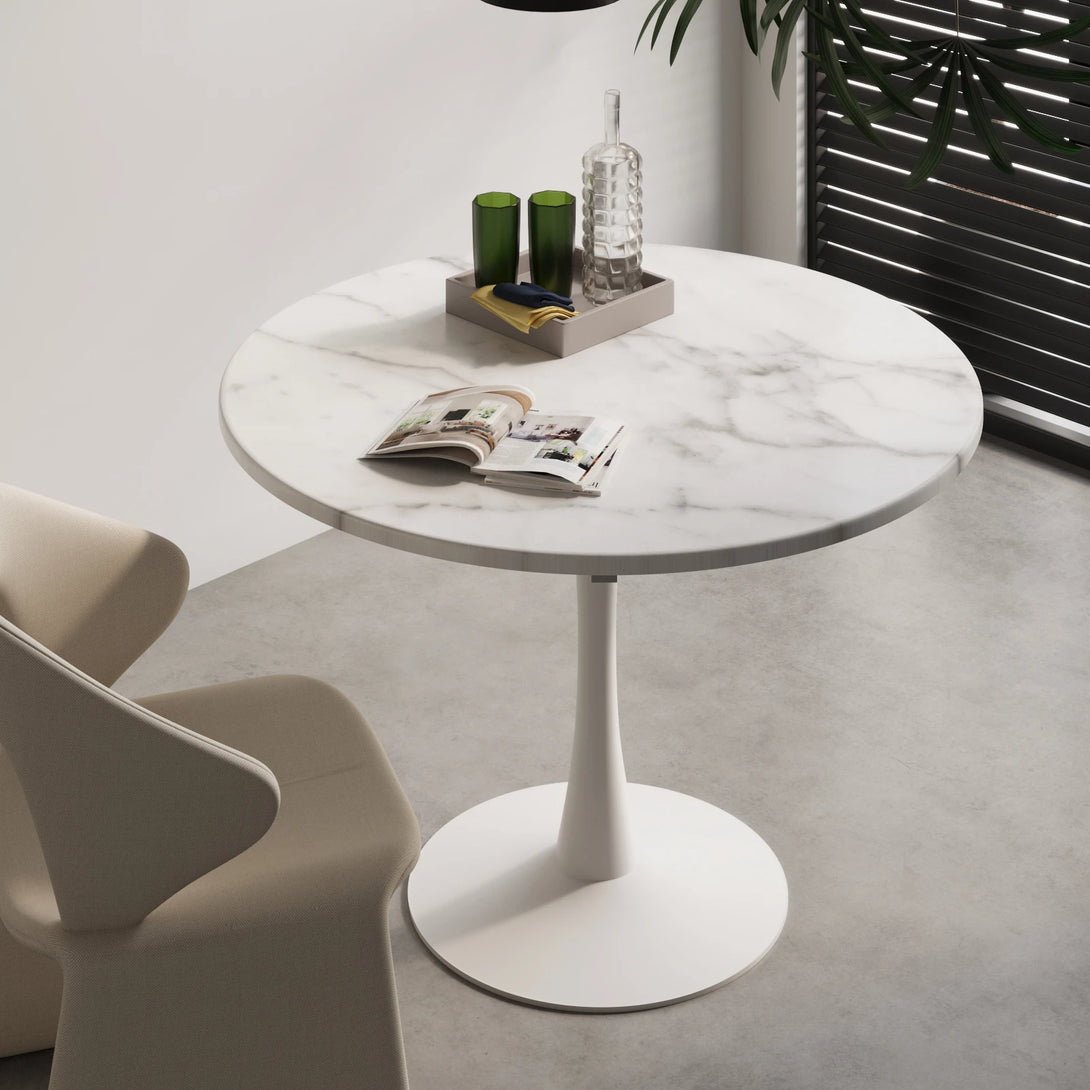 This round coffee table features a smooth white marble tabletop for a modern look and easy cleaning. Supported by a central pedestal, it offers a minimalist design that saves space. Perfect for living rooms, lounges, or offices.