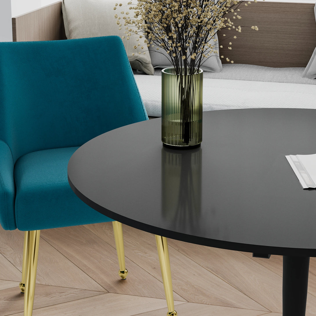This round coffee table features a smooth black tabletop for a modern look and easy cleaning. Supported by a central pedestal, it offers a minimalist design that saves space. Perfect for living rooms, lounges, or offices.