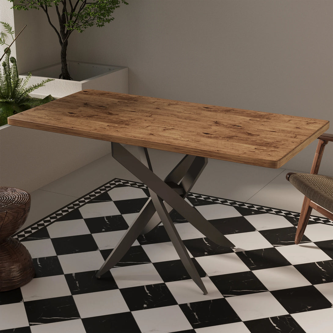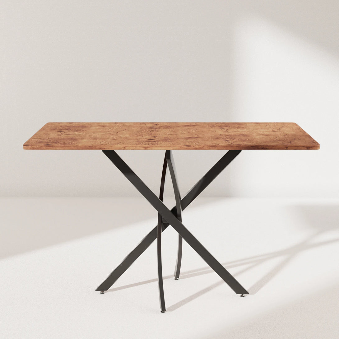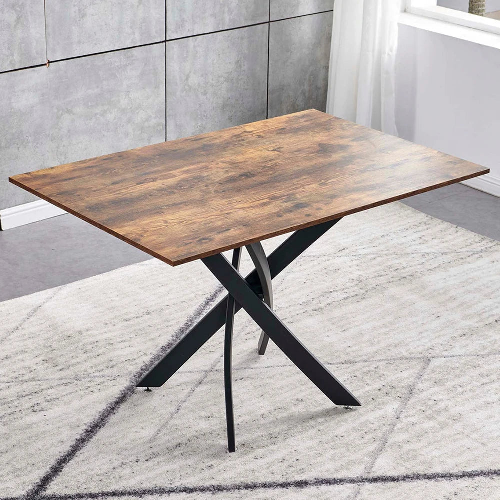 Vintage Meets Modern: Rectangular table with a weathered wood-textured top for rustic charm and black metal X-shaped base for a contemporary touch.