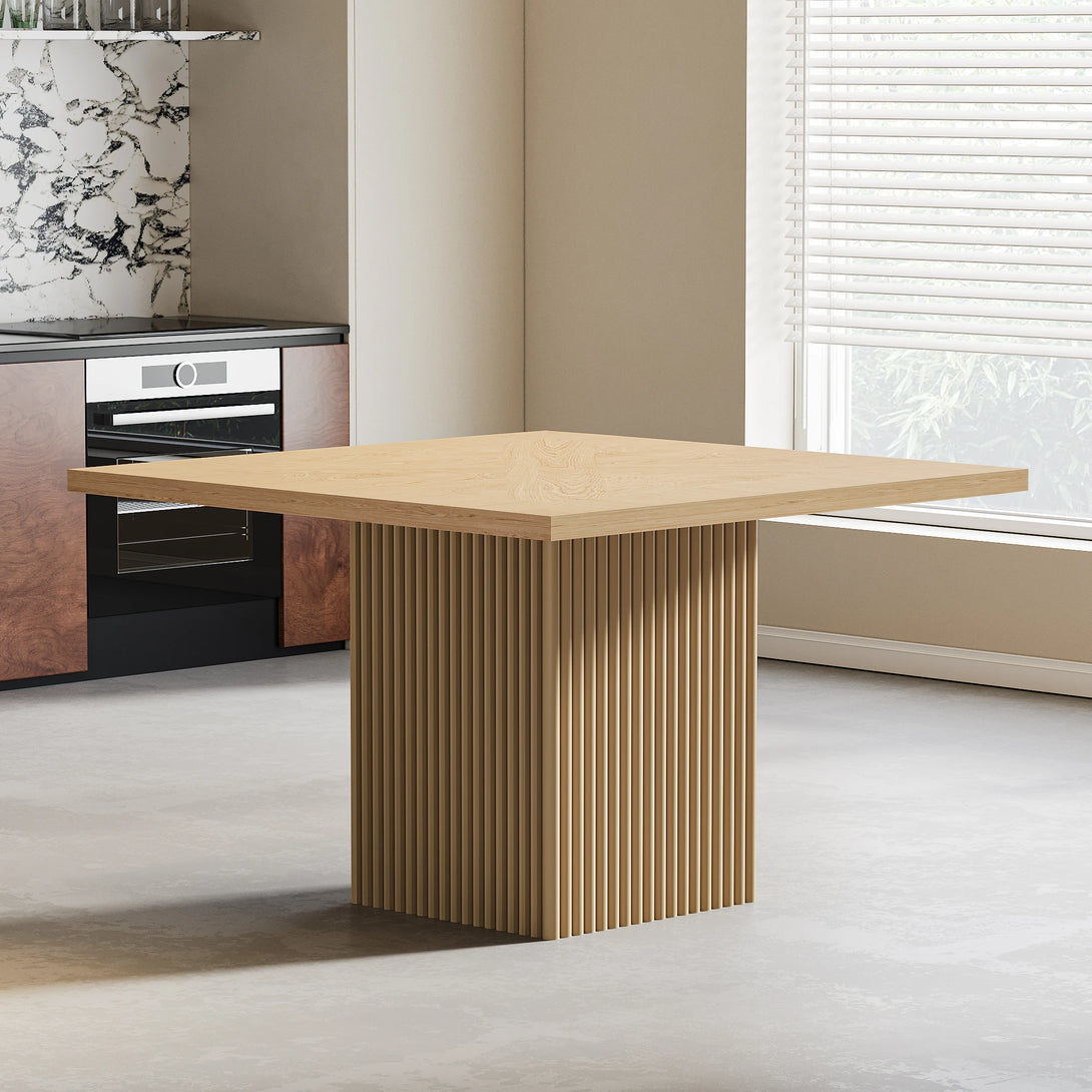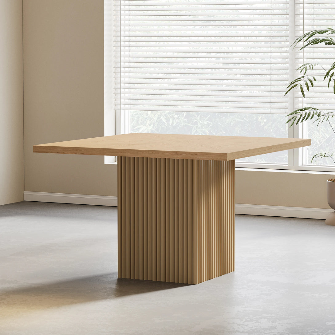 The tabletop features a square design crafted from light-colored wood, beautifully showcasing the natural grain for a warm and inviting look. The legs are designed as square columns with vertical ribbed detailing, adding both visual texture and strong stability.Perfect for use in dining rooms or living rooms, this table enhances your space with a natural, cozy atmosphere while maintaining modern simplicity.