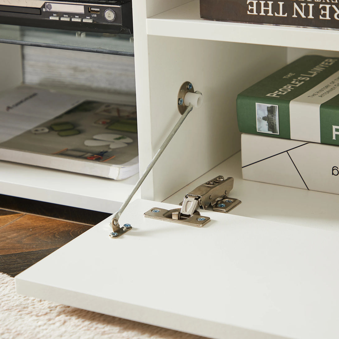 Modern LED TV Stand with 16 RGB colors, 4 modes & brightness control via remote.fits TVs up to 55". Features 2 drawers for storage, made of durable P2 particleboard, scratch-proof, waterproof, easy to clean, and easy to assemble.