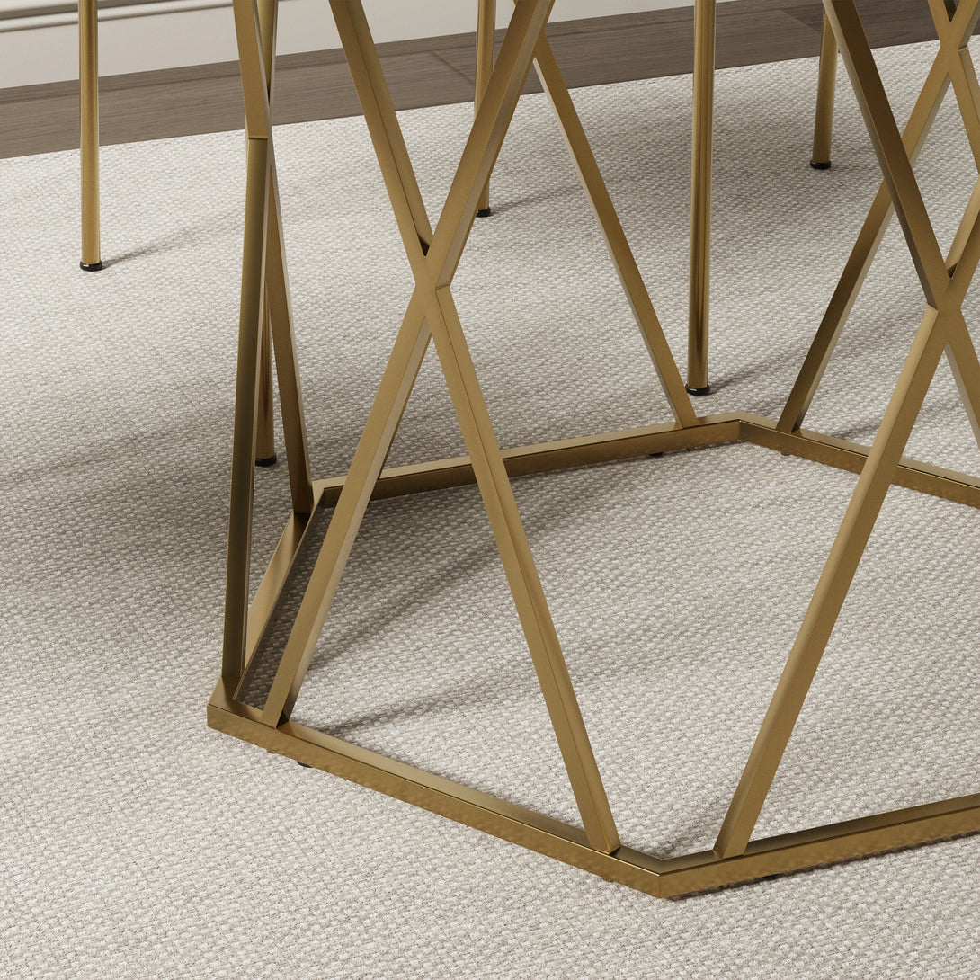 Featuring a clear glass top and golden hexagonal metal frame, this table blends style and durability. Its sturdy structure ensures long-lasting use while adding artistic appeal. Perfect for living rooms, bedrooms, or offices.