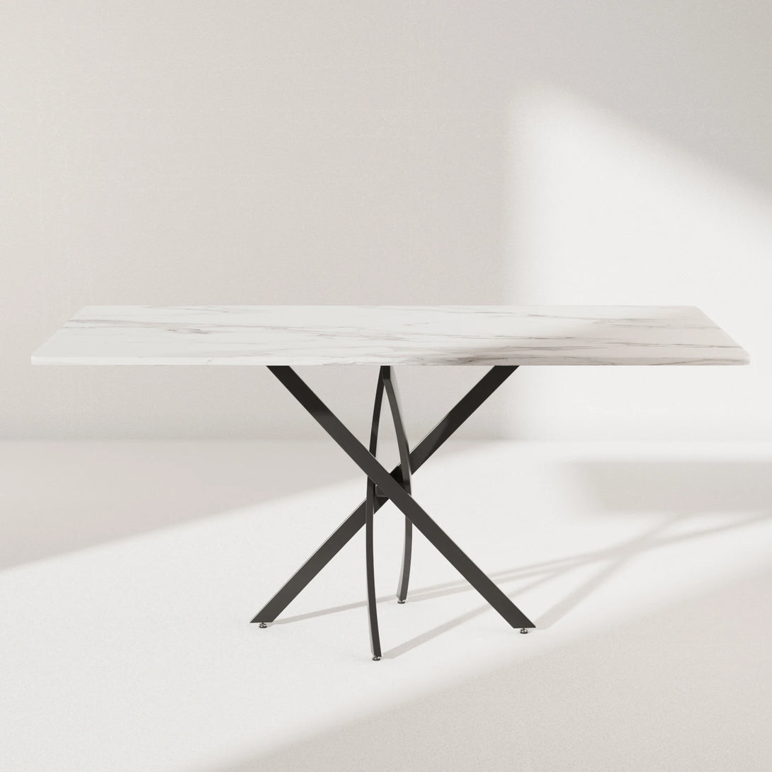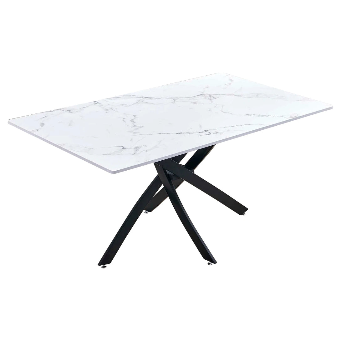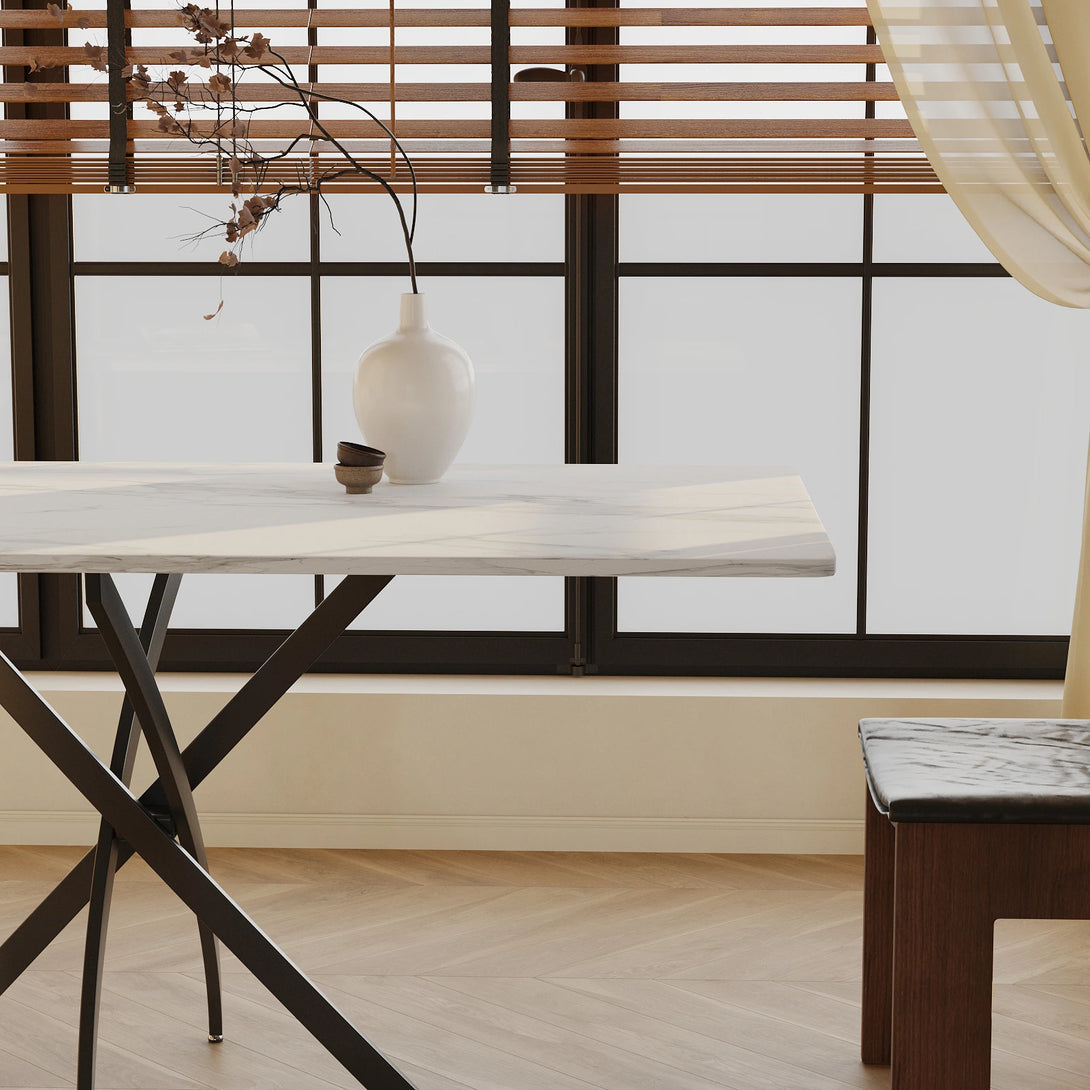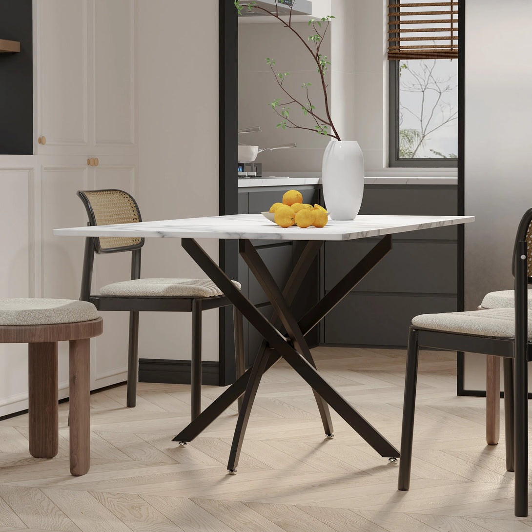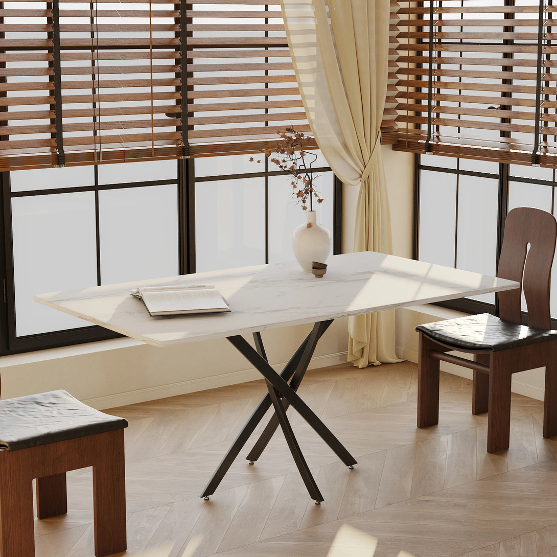 This rectangular dining table blends rustic charm with modern design. The weathered wood-textured tabletop highlights natural grain and a nostalgic warmth, bringing timeless character to your space. Its sturdy black X-shaped metal base ensures excellent stability while adding a sleek, contemporary touch. Versatile in style, it fits seamlessly into farmhouse, industrial, or modern interiors, making it perfect for both daily meals and special gatherings.