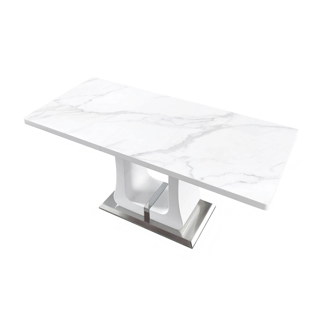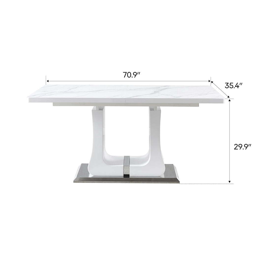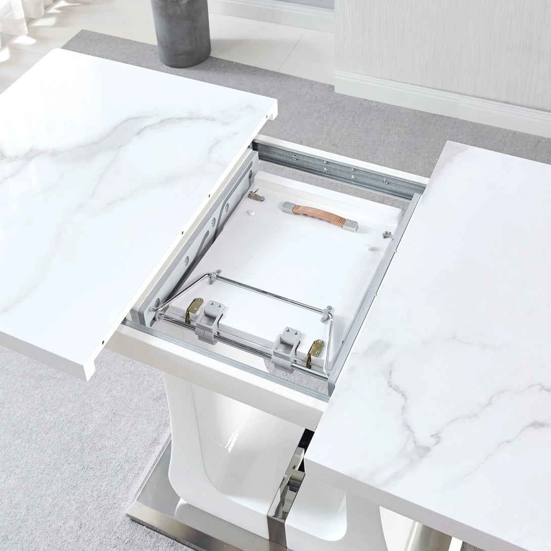 The tabletop is finished in white with a minimalist design that complements a variety of interior styles. It features a central extendable panel that easily pulls out to expand the surface area—perfect for accommodating more guests or serving as a versatile workspace.
