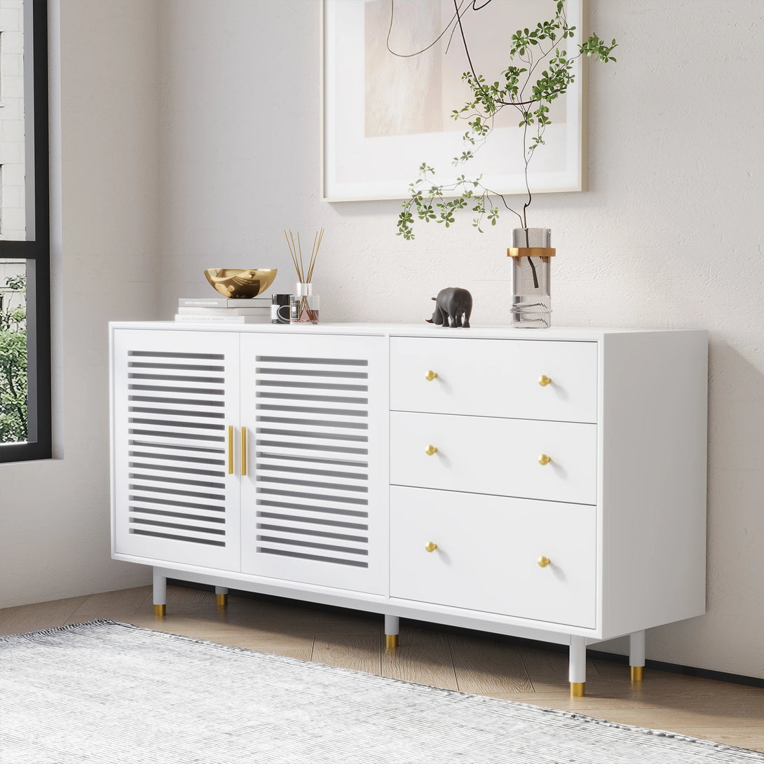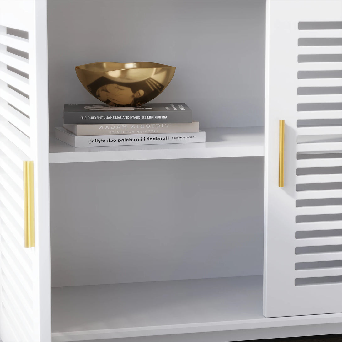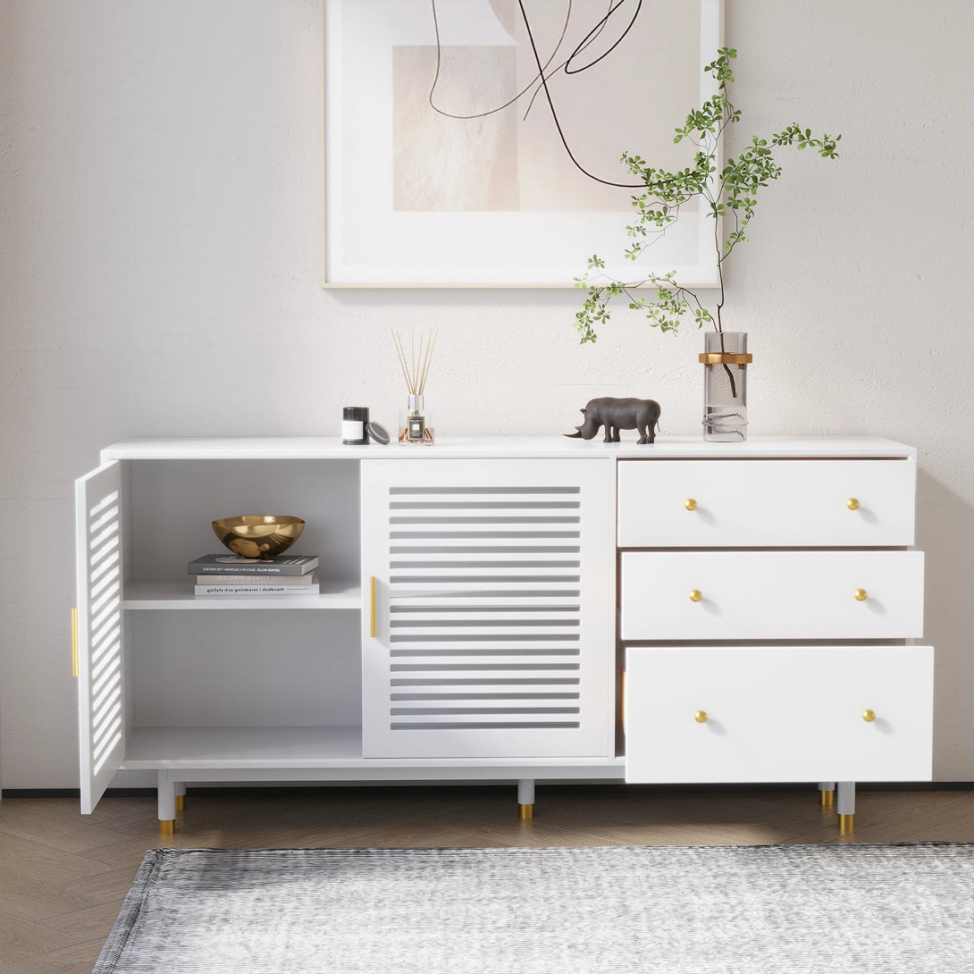 Features: Louvered doors and drawers provide ample storage, while gold handles and legs add luxury and modern style.