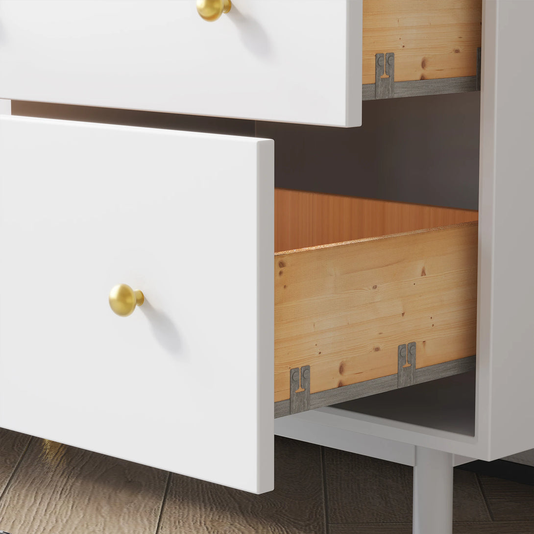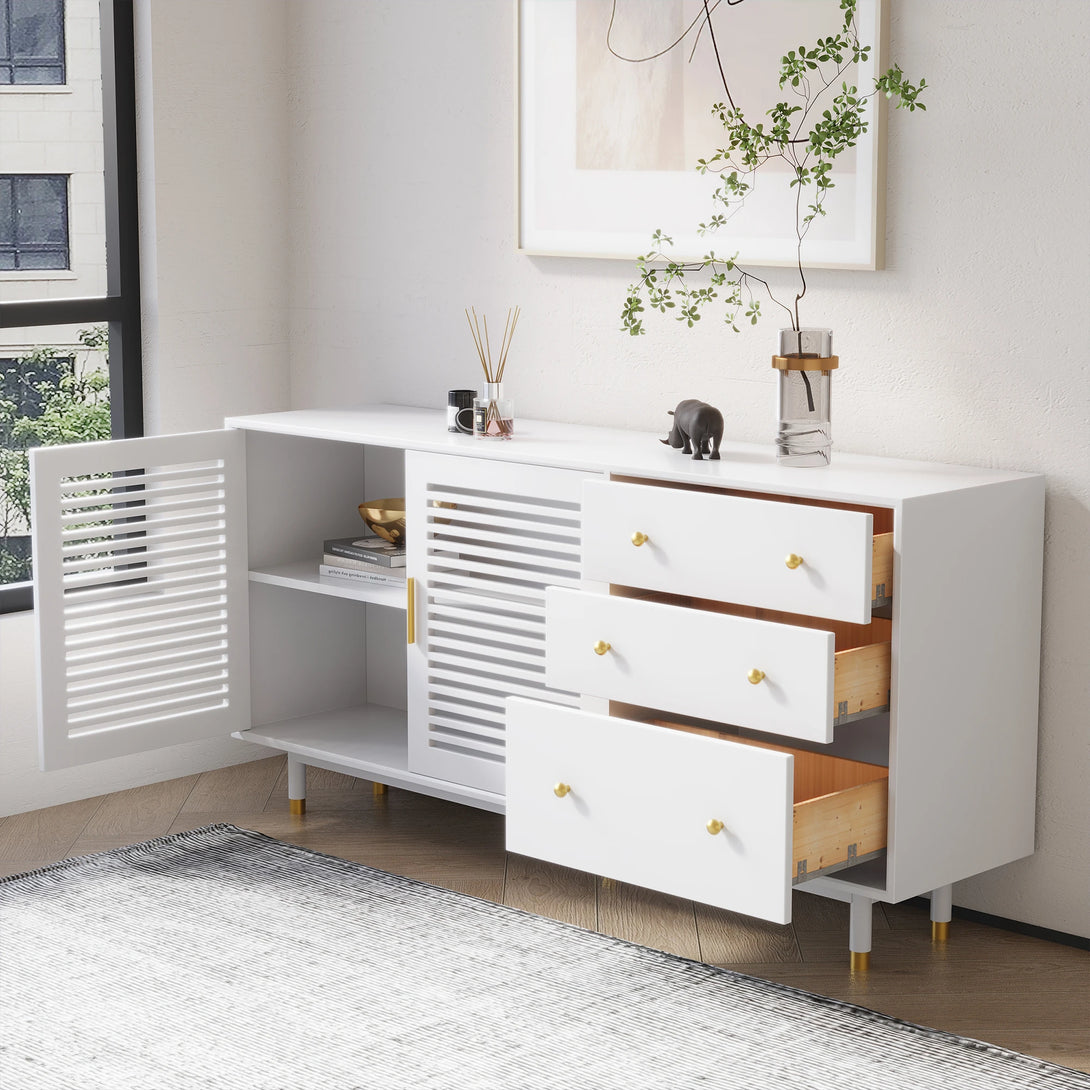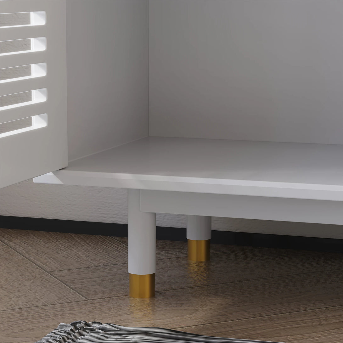 Features: Louvered doors and drawers provide ample storage, while gold handles and legs add luxury and modern style.