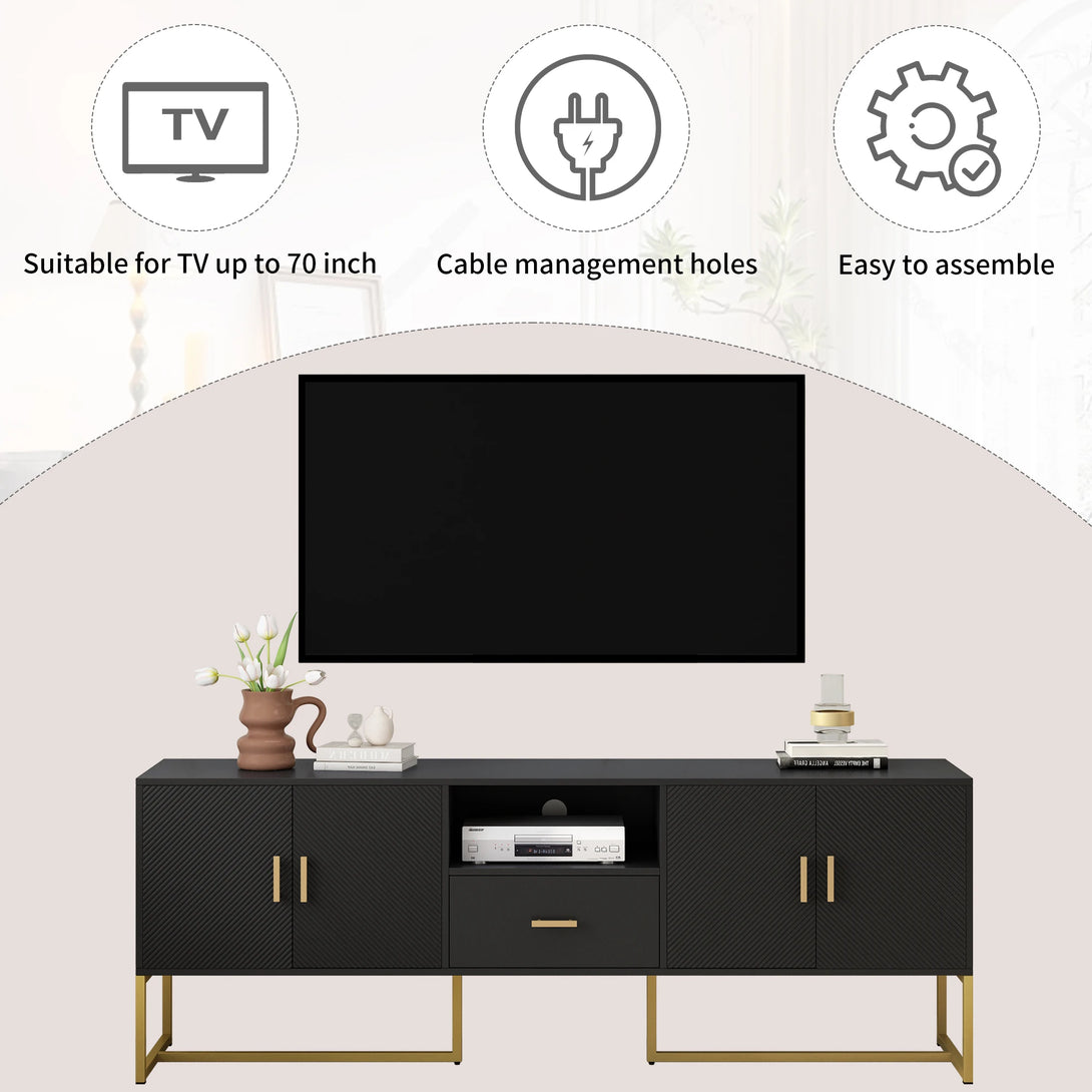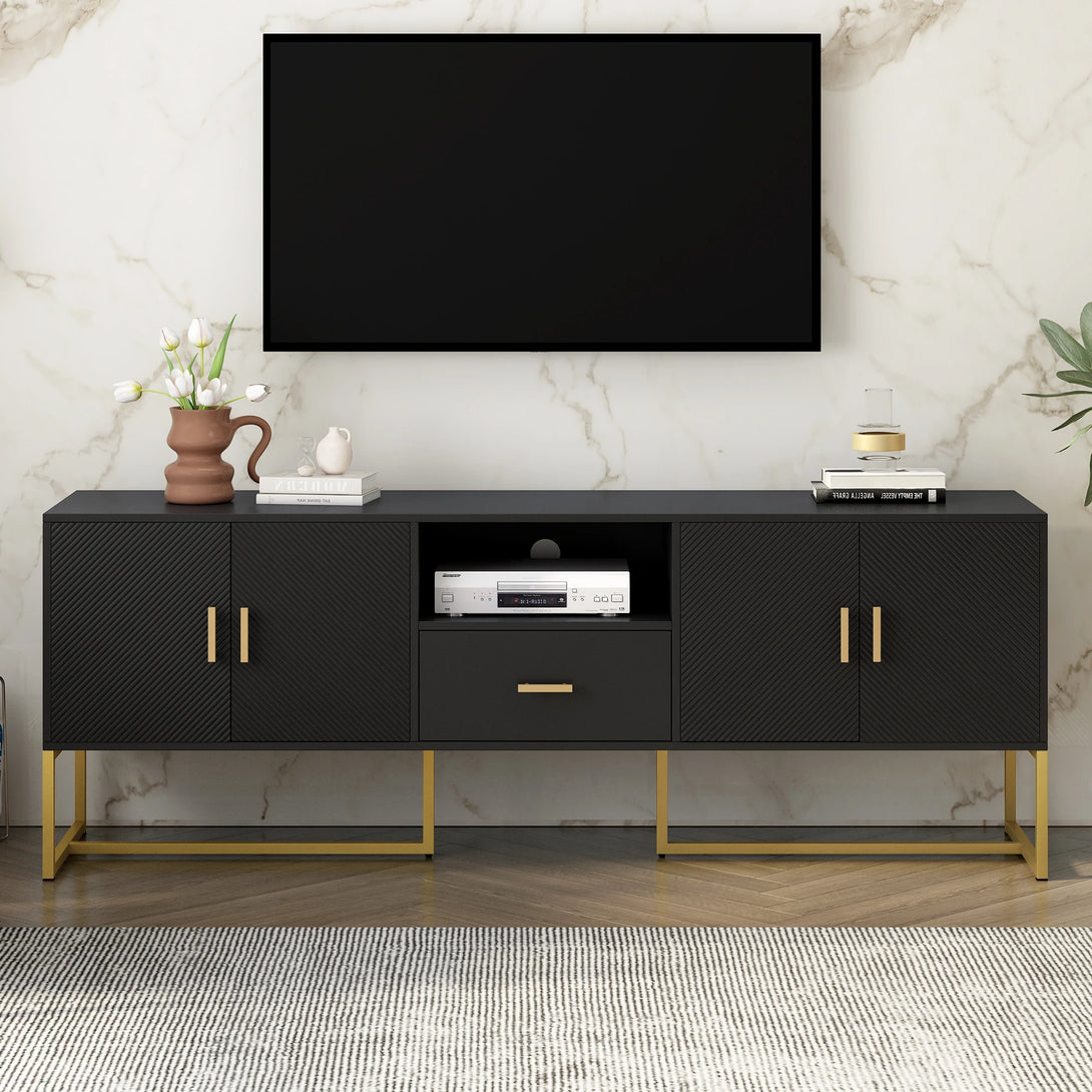 Storage: Includes open shelves and drawers for media storage
