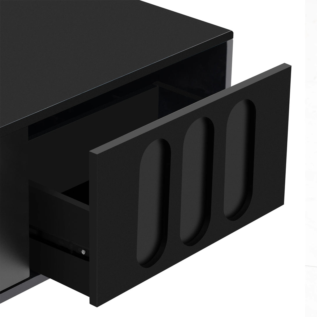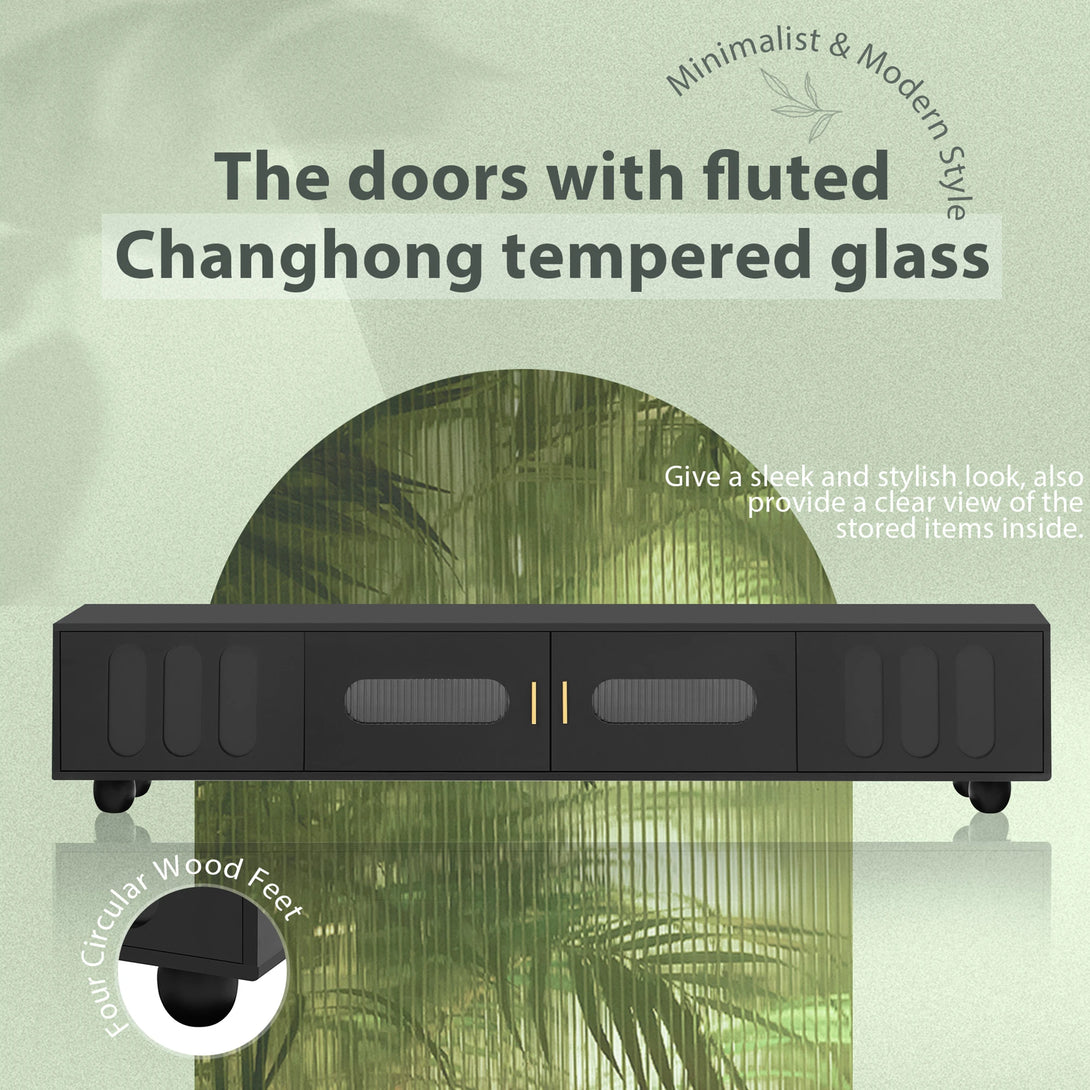 This modern TV stand features clean lines and subtle details, ideal for any living room. It includes two metal handles, four circular feet for stability, and a cable management hole for a tidy setup. Spacious drawers and cabinets provide ample storage. Assembly required with instructions included.