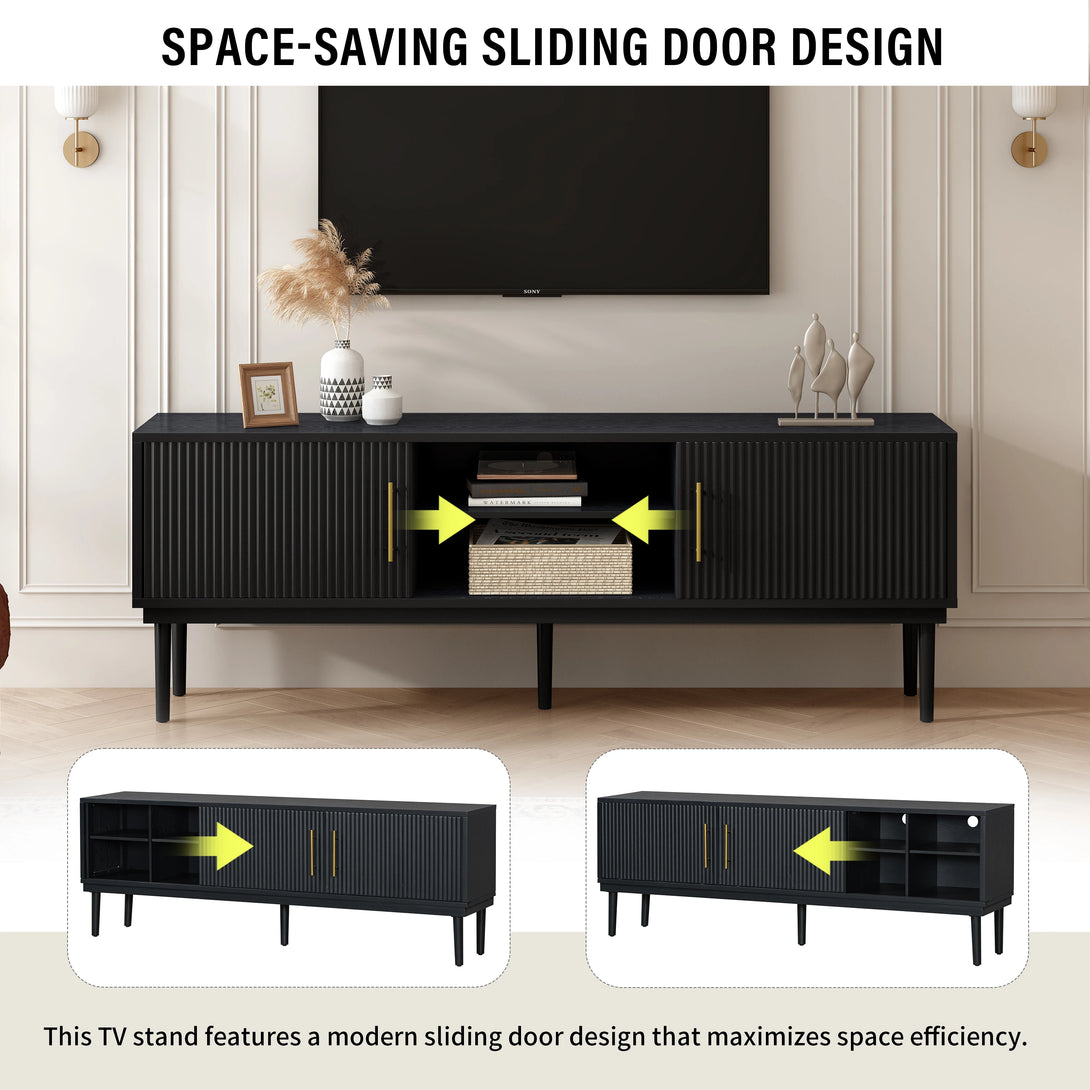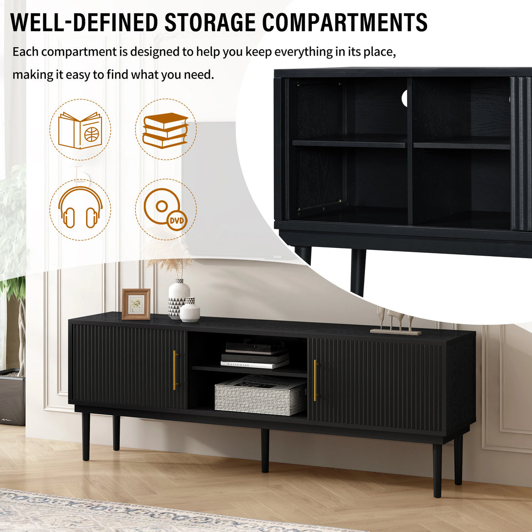 Smooth sliding doors save space and provide easy access to well-divided interior compartments, perfect for organizing media equipment, books, or décor.