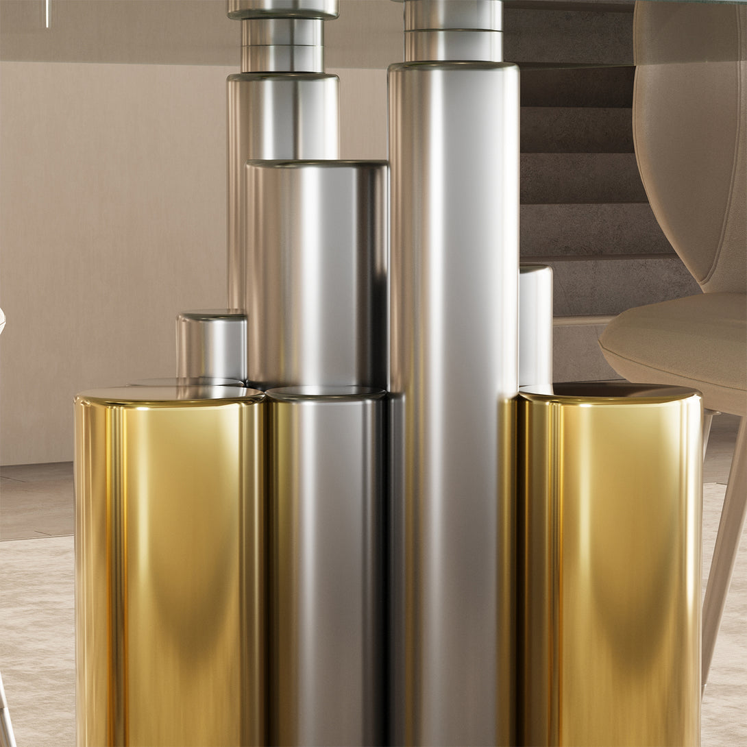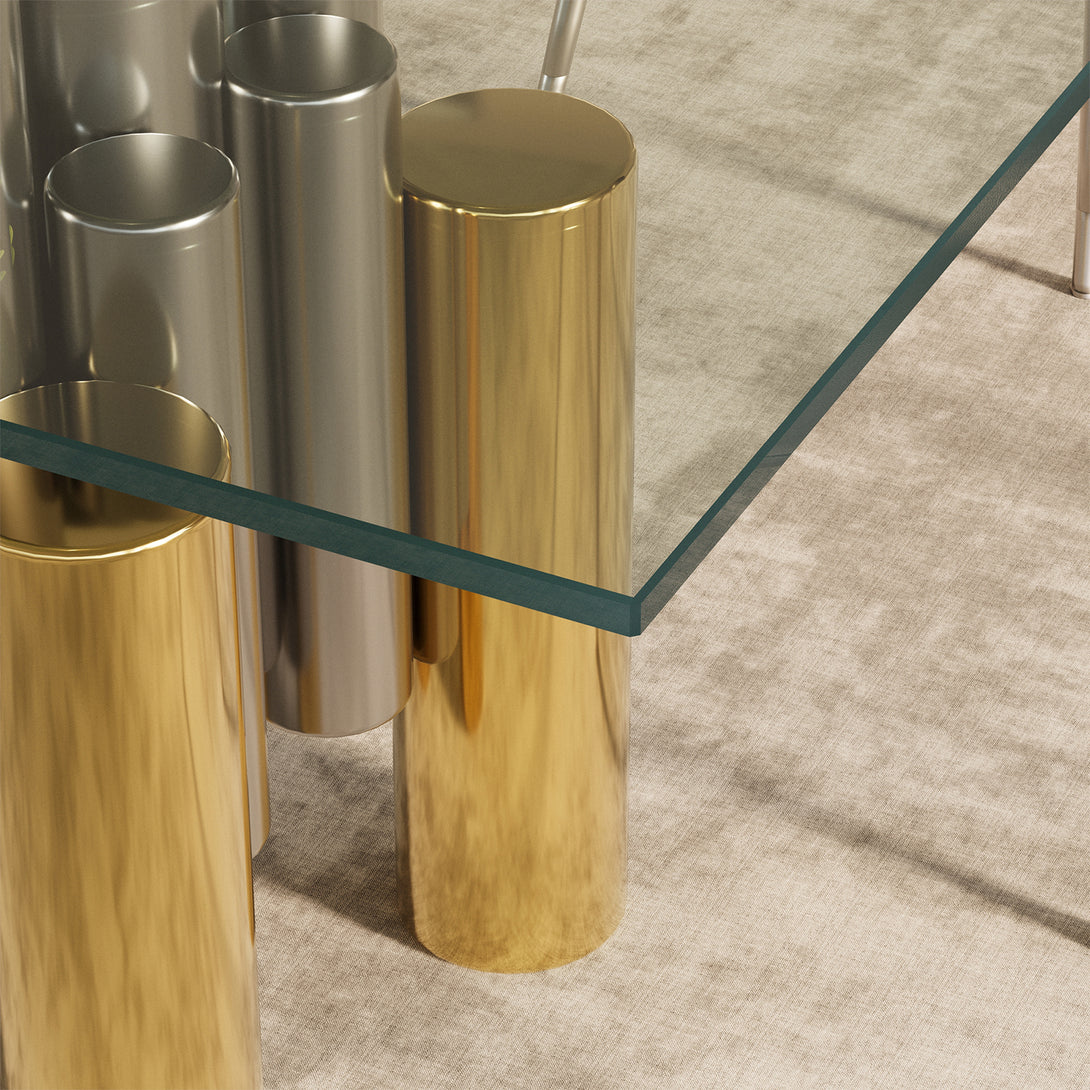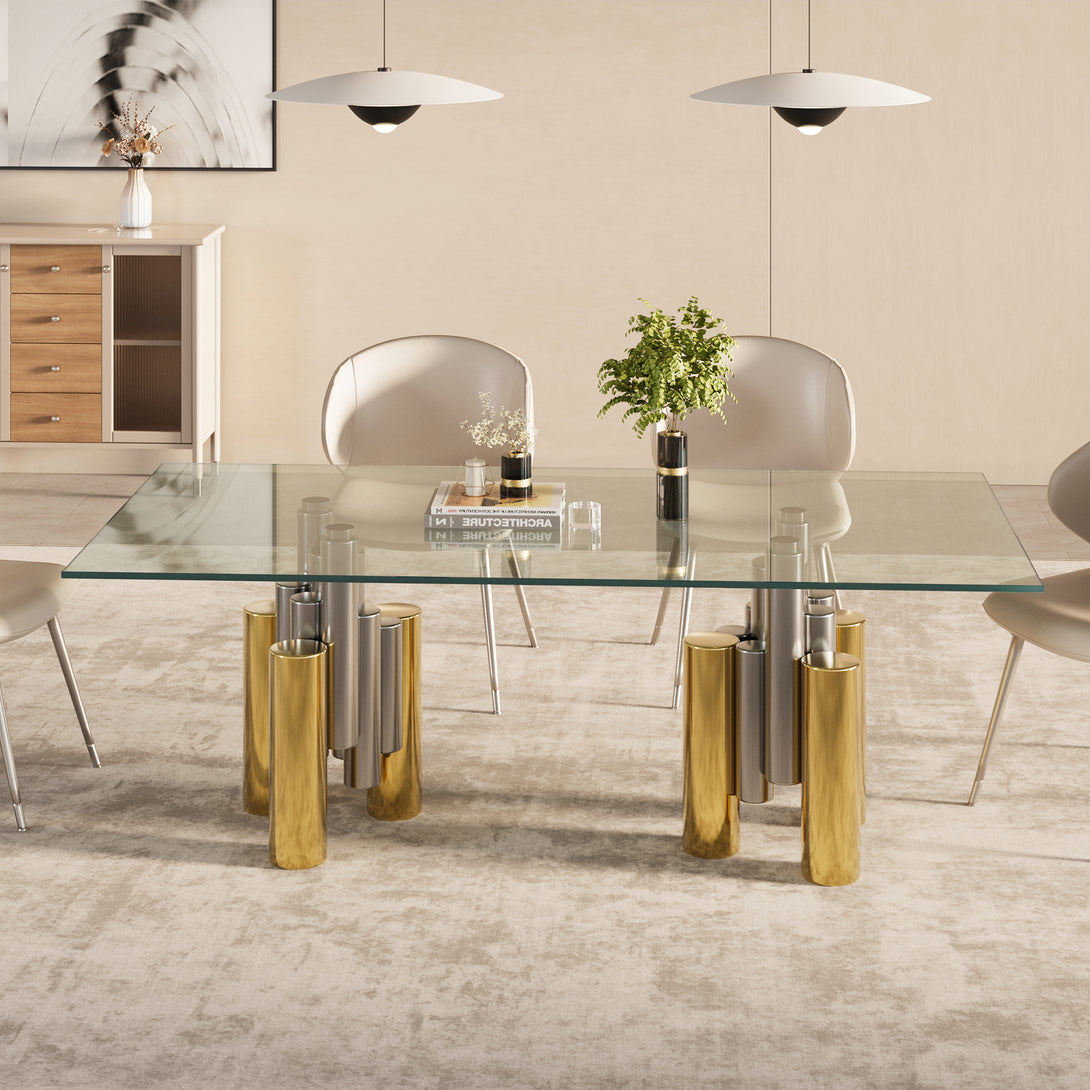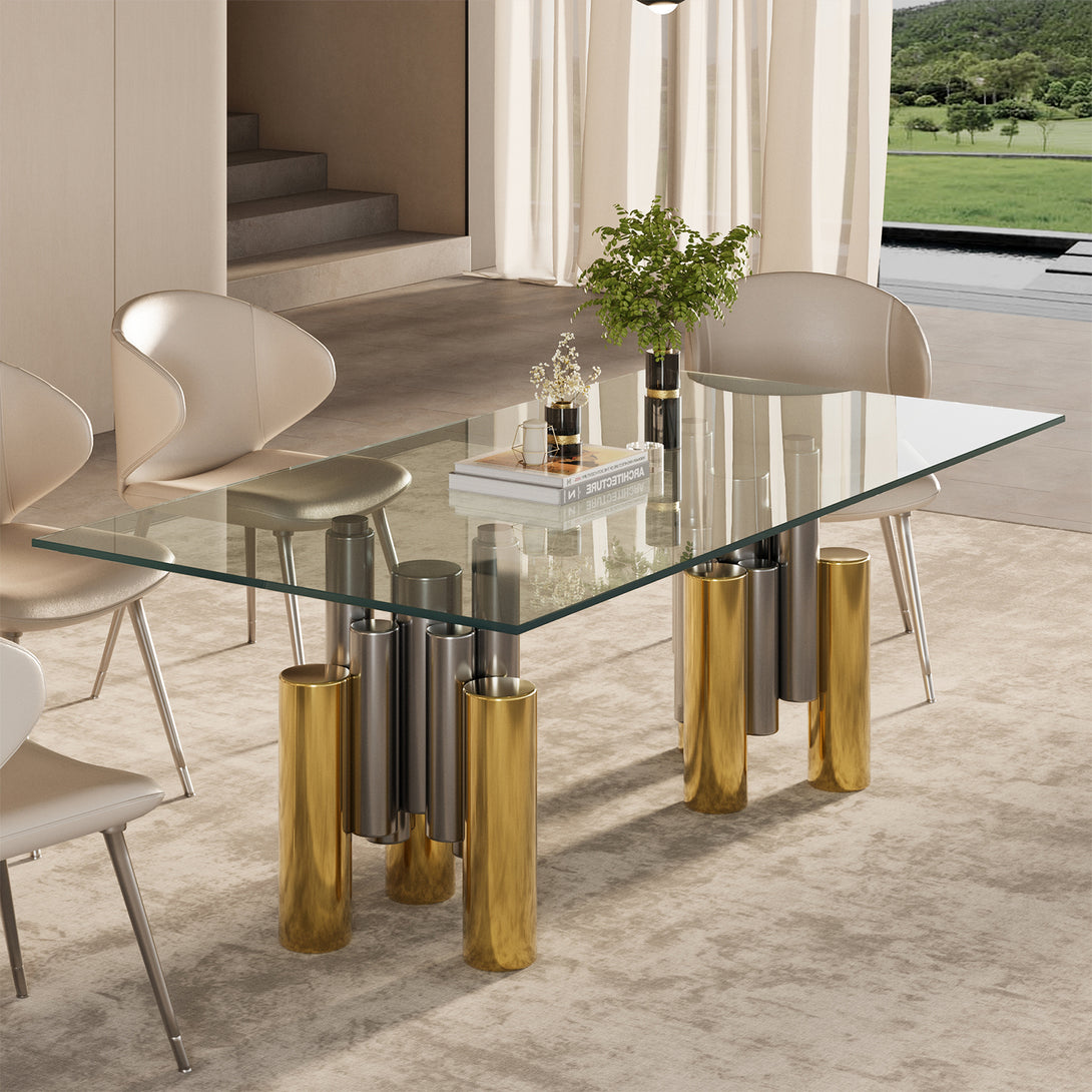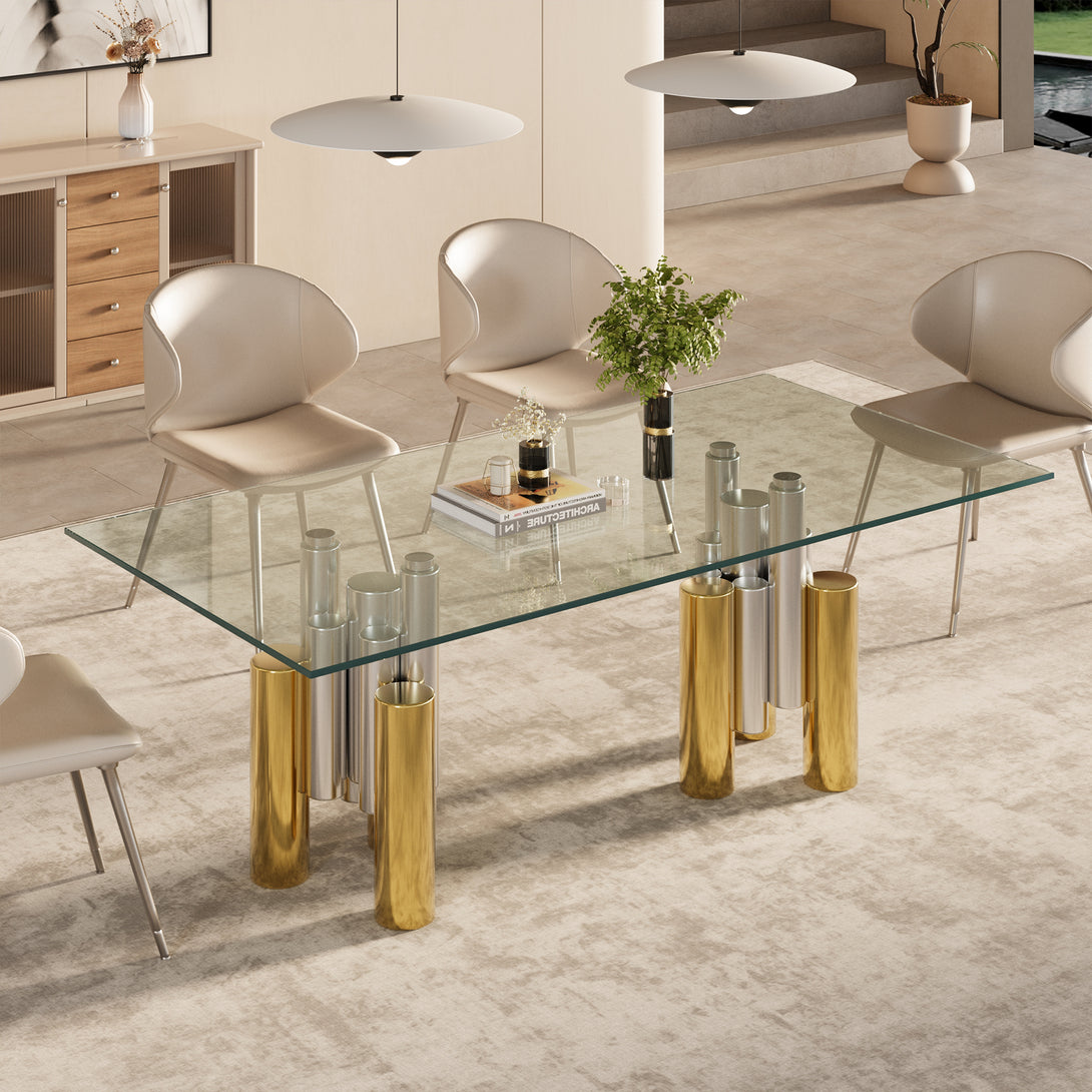 The tabletop is made of clear glass, offering a transparent view and a sleek modern feel. The legs are uniquely designed with multiple gold and silver metal columns, forming a stable support structure while enhancing the table with a sense of luxury and artistry.