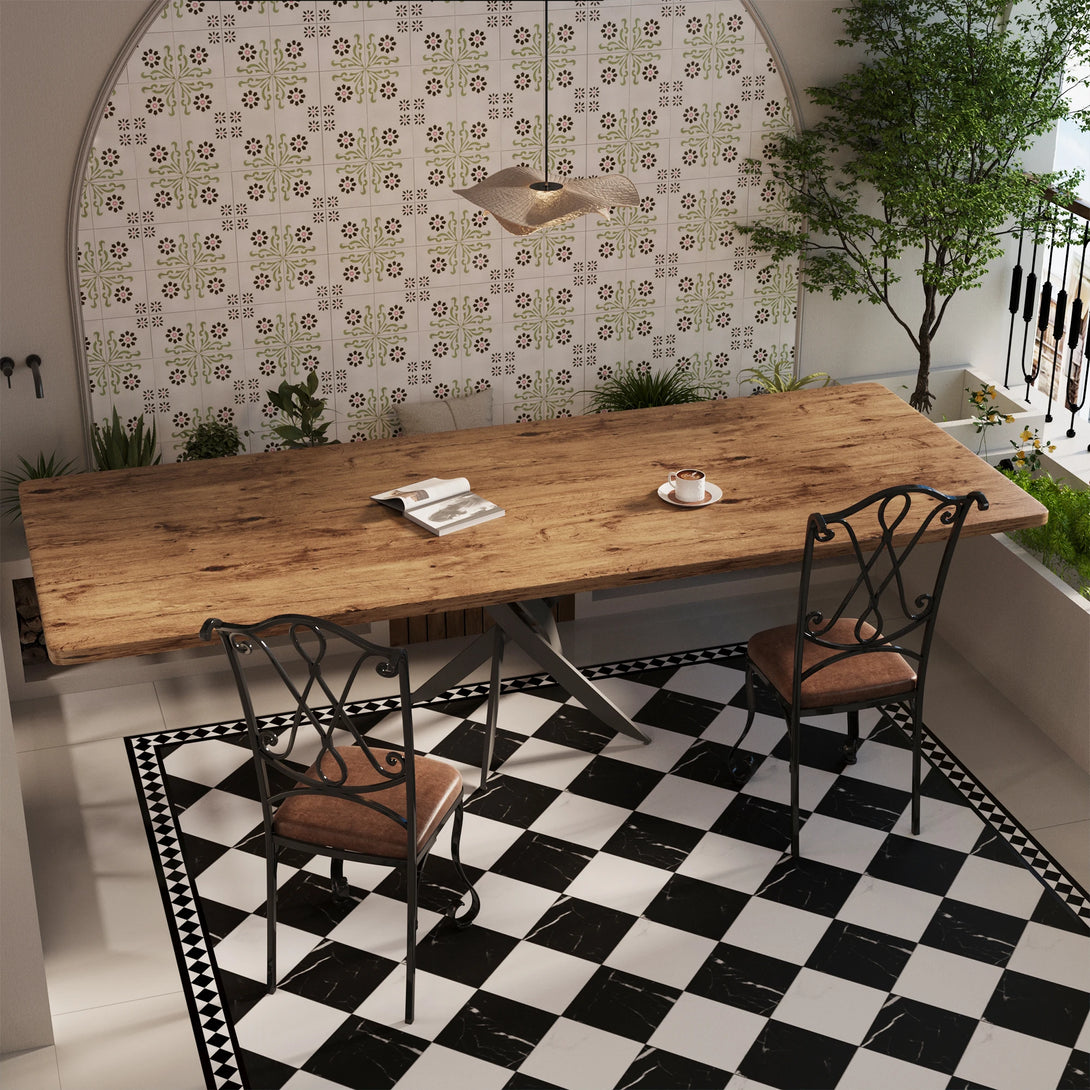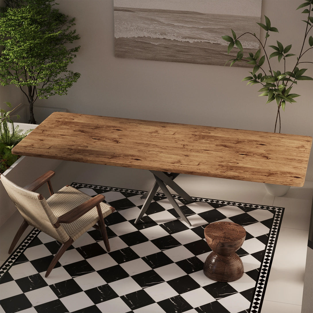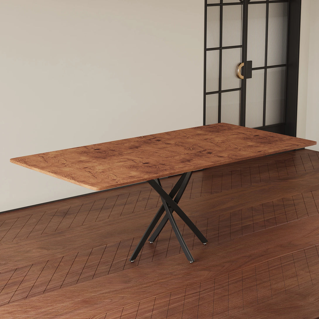 Rectangular Dining Table This rectangular dining table blends vintage and modern style with a weathered wood tabletop and sturdy black X-shaped metal base. Its rustic yet elegant design fits various spaces, ideal for daily meals or special occasions.