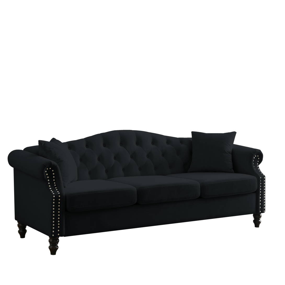 Material: Black velvet upholstery with foam filling, solid wood frame, and nailhead trim.