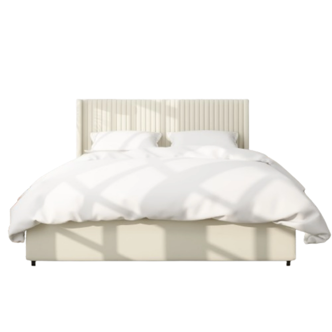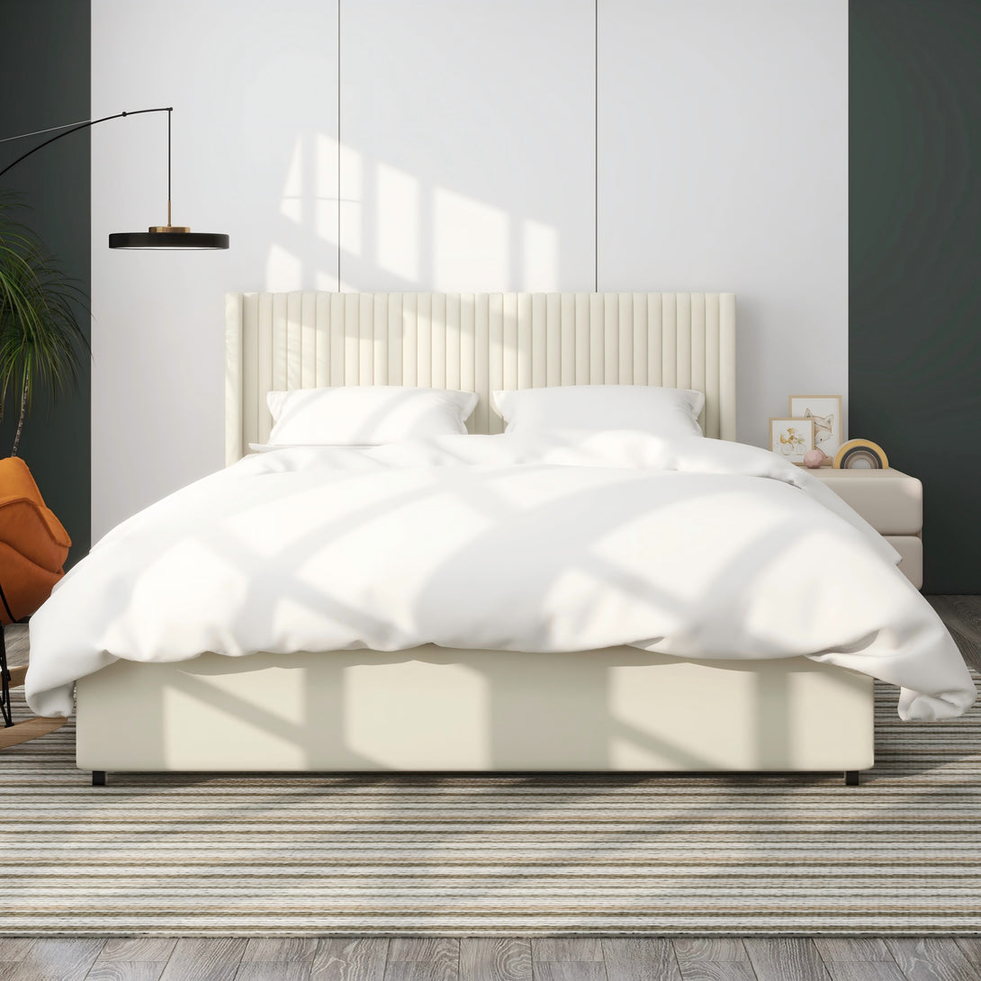 Transform your bedroom with this modern transitional bed, upholstered in soft velvet with a wingback headboard and channel tufting. Designed with a patented under-bed drawer system, it offers smart, dust-proof storage for everyday essentials. A sturdy powder-coated metal frame, reinforced rails, and wooden slats provide reliable support—no box spring required. With a 1,000 lb capacity, this bed combines style, durability, and functionality in one.