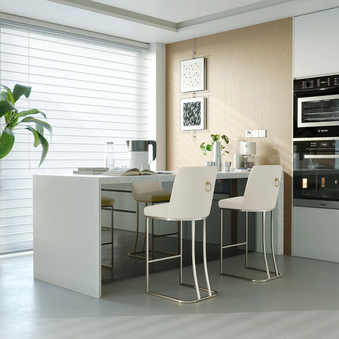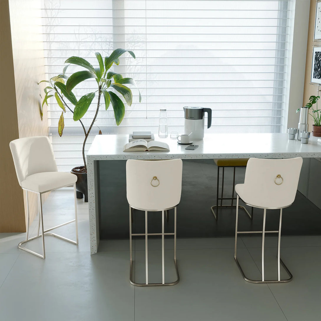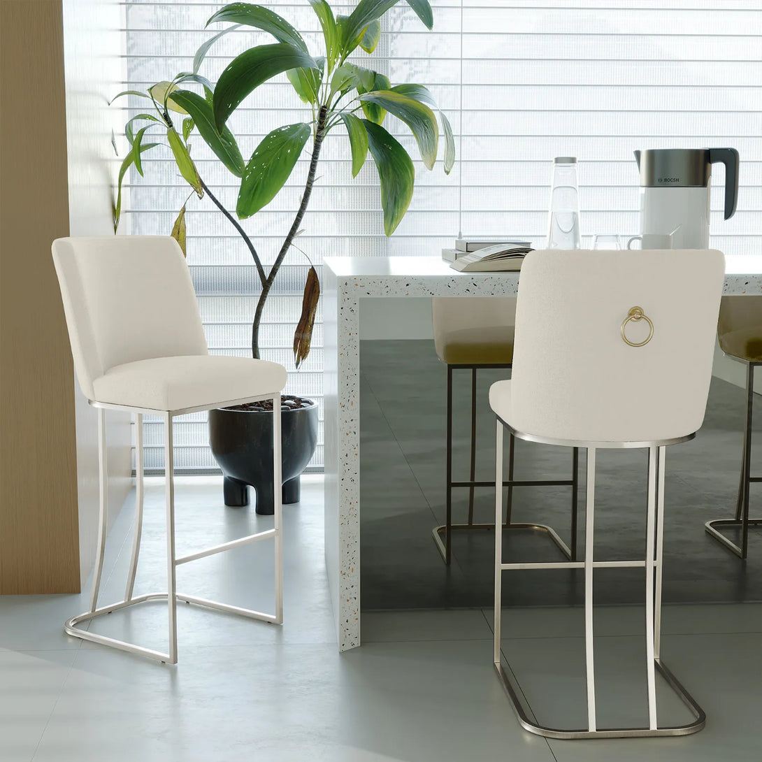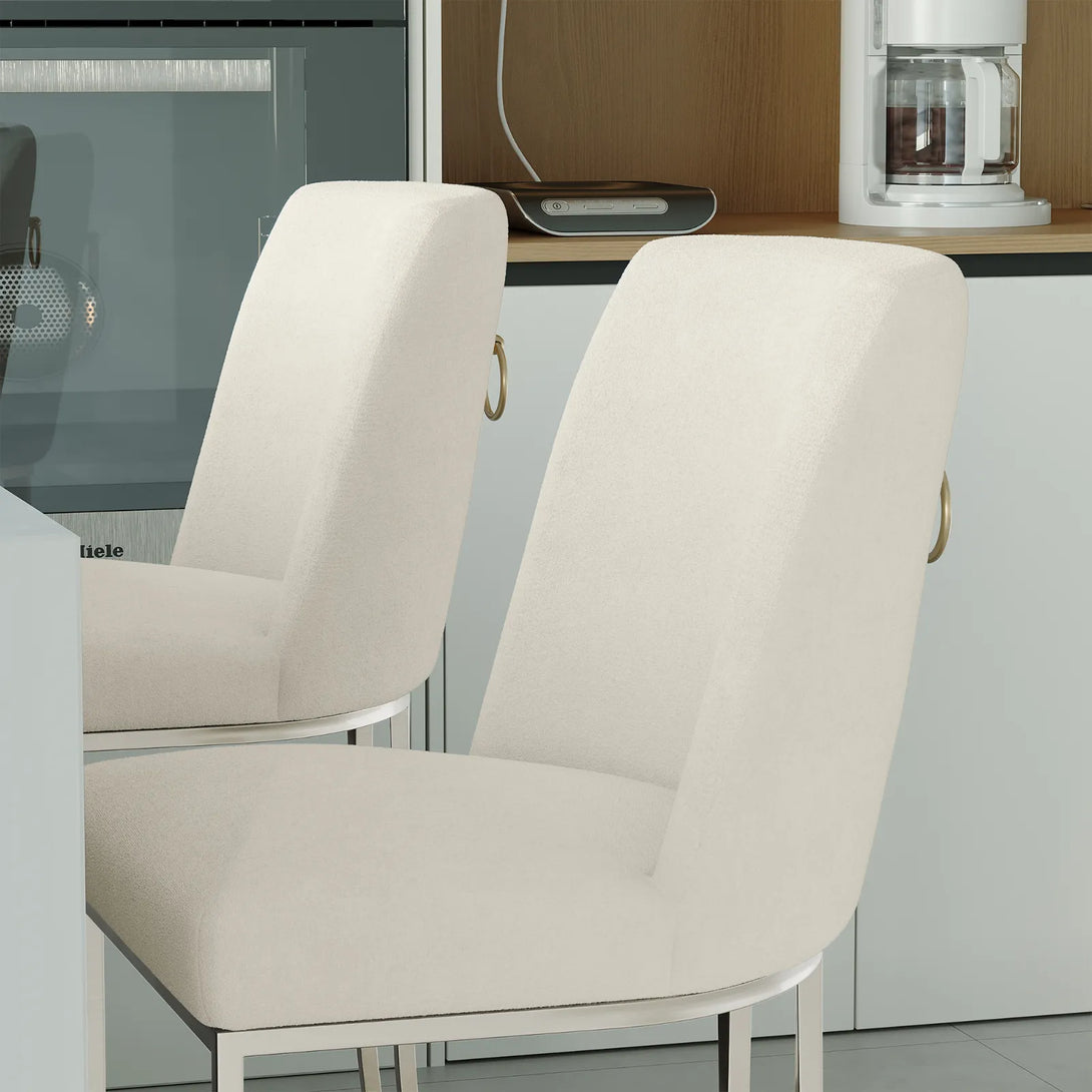 Add modern elegance to your space with these fabric chairs, available in five colors. Featuring high-density foam for comfort and a brushed silver or gold base, each chair supports up to 350 lbs. Perfect for kitchen islands, bars, or dining areas.