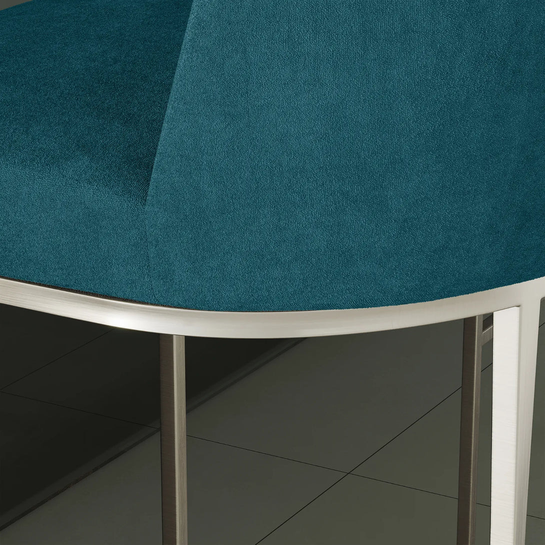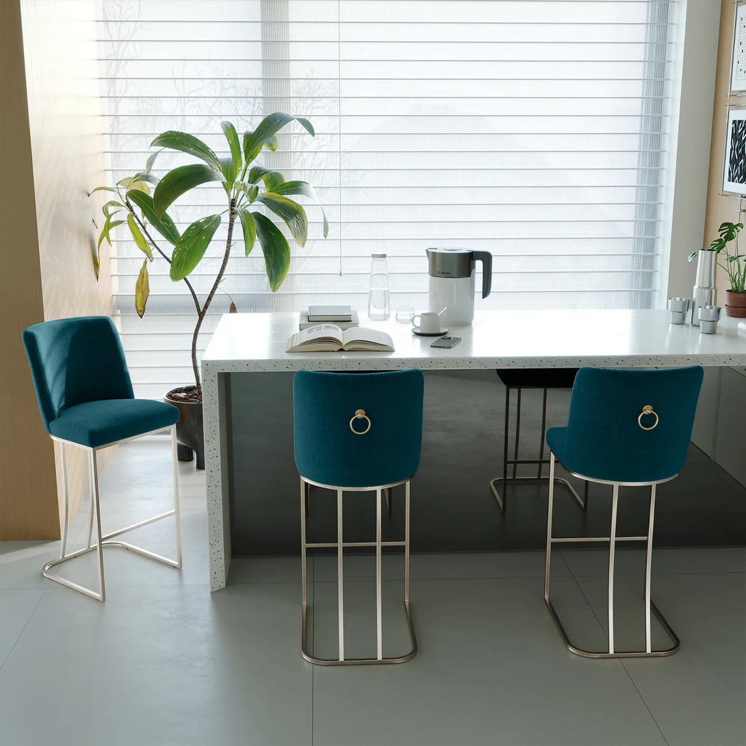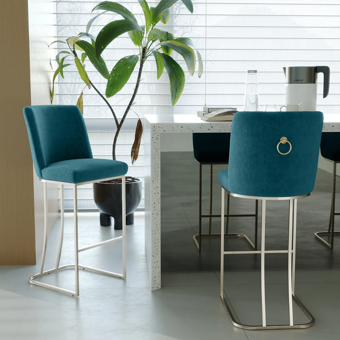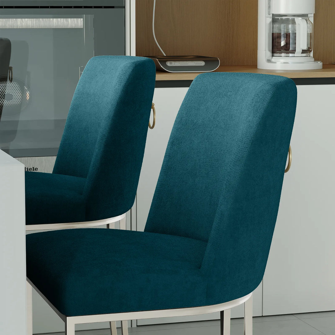 Add modern elegance to your space with these fabric chairs, available in five colors. Featuring high-density foam for comfort and a brushed silver or gold base, each chair supports up to 350 lbs. Perfect for kitchen islands, bars, or dining areas.