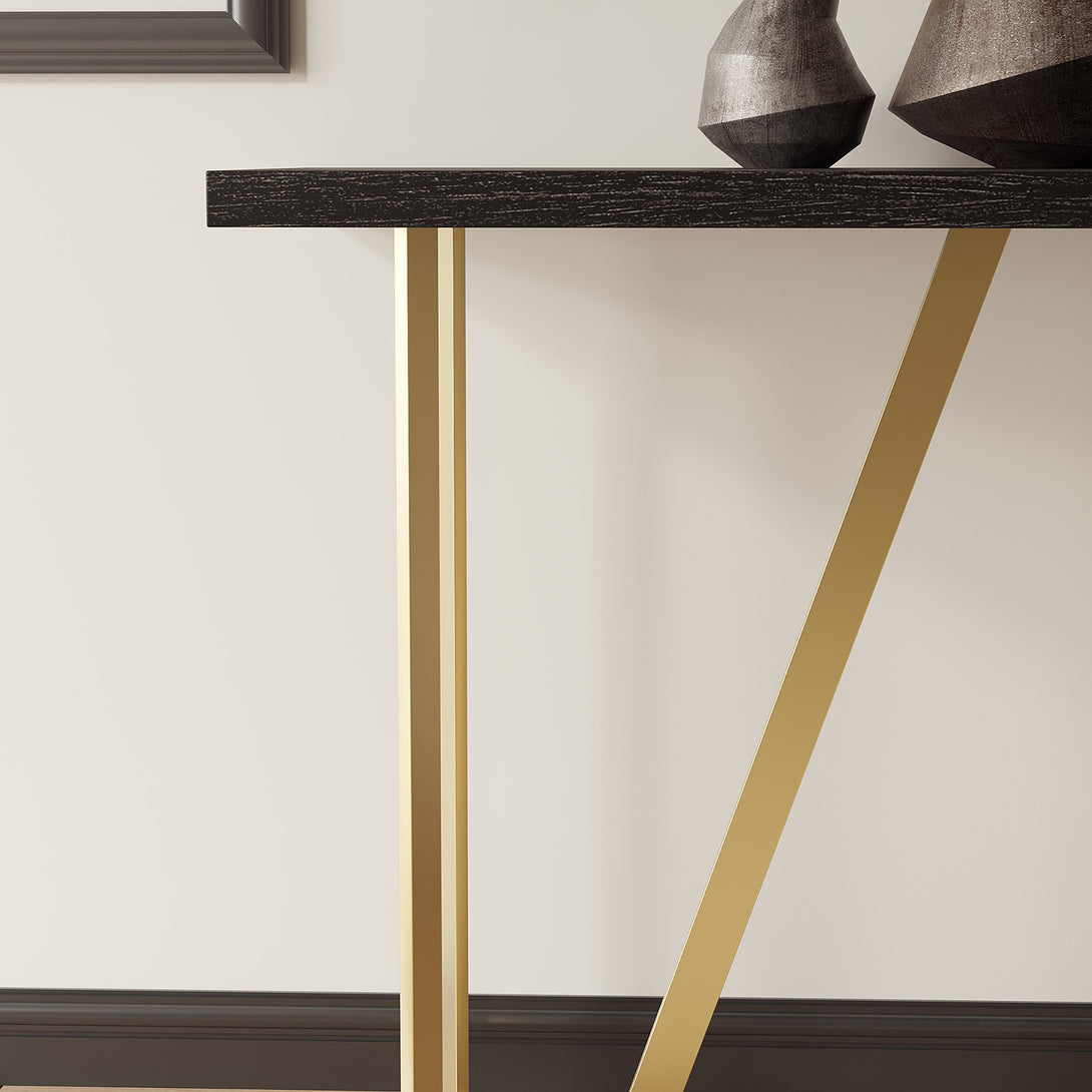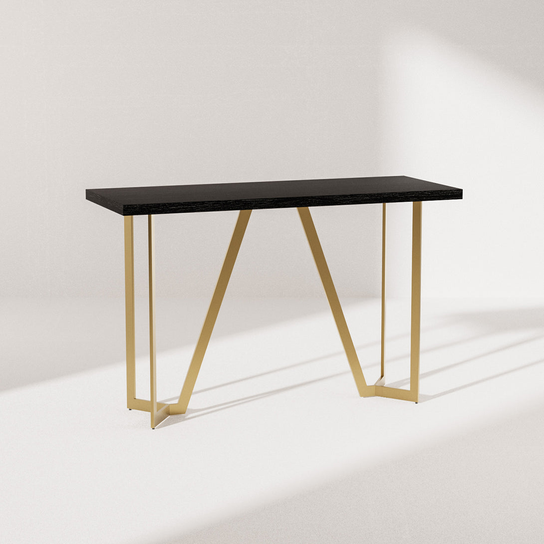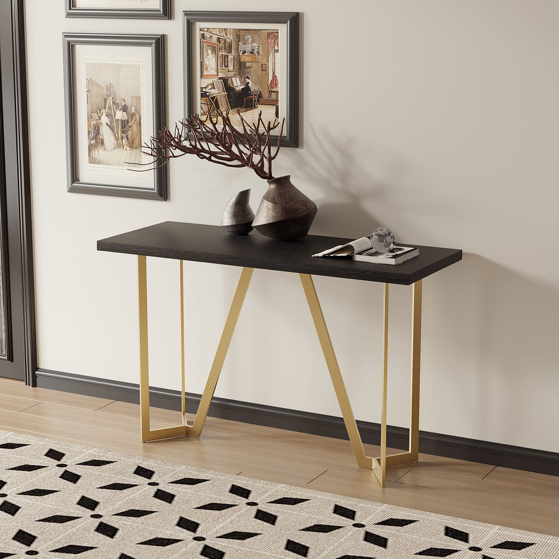 Add sophistication to your space with this black rectangular top console table. Designed with a bold black top and a sleek brushed gold base, it blends modern elegance with timeless style. Crafted from MDF, plywood, and metal, it is durable and versatile, making it ideal for entryways, living rooms, or hallways.
