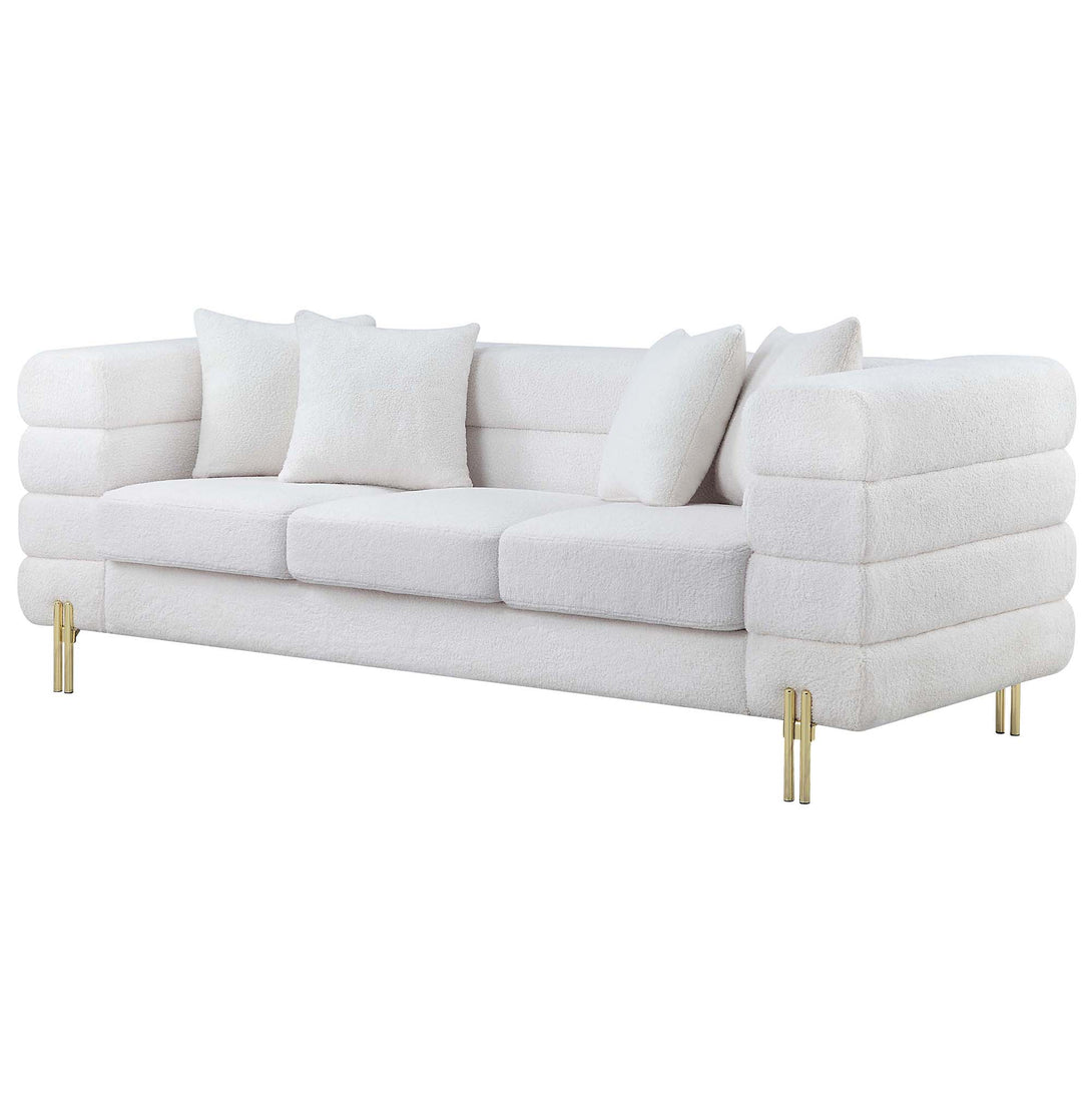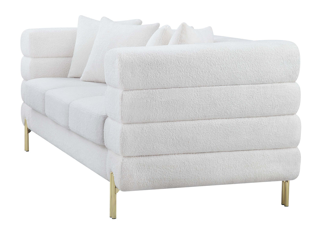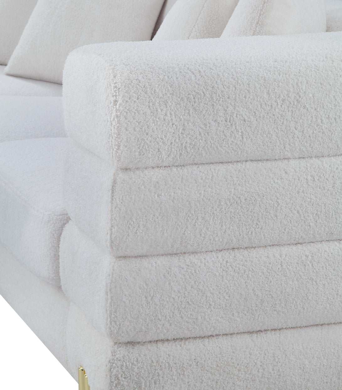 Features: Premium boucle upholstery, durable construction with foam cushioning, elegant gold metal legs