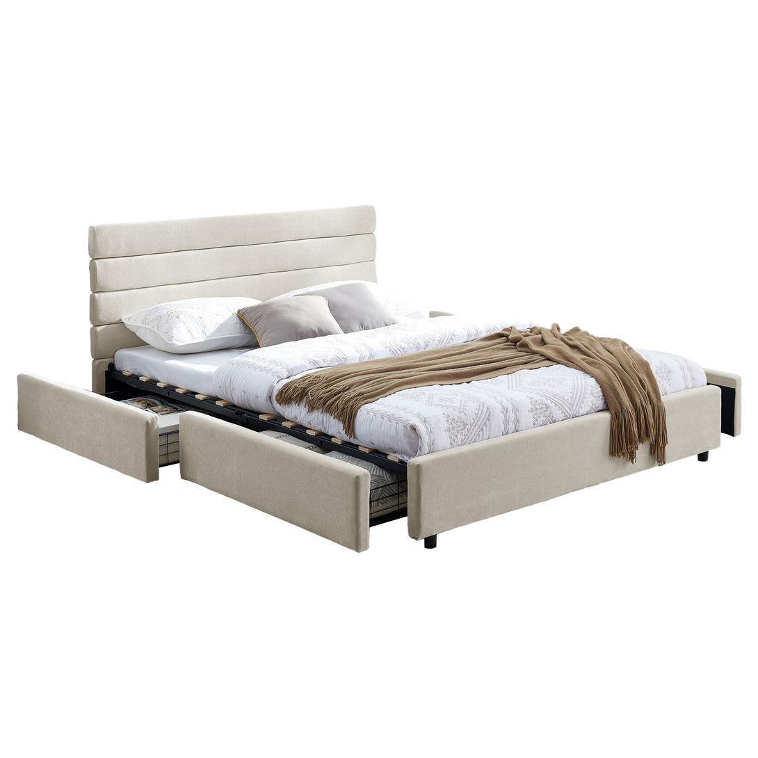Queen-size beige upholstered bed with cushioned headboard and solid frame. Soft velvet upholstery adds comfort, while built-in drawers with rollers provide convenient storage. Modern platform design with clean lines creates a cozy and elegant bedroom centerpiece.