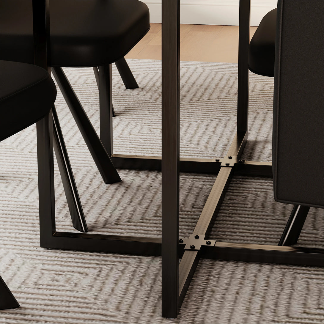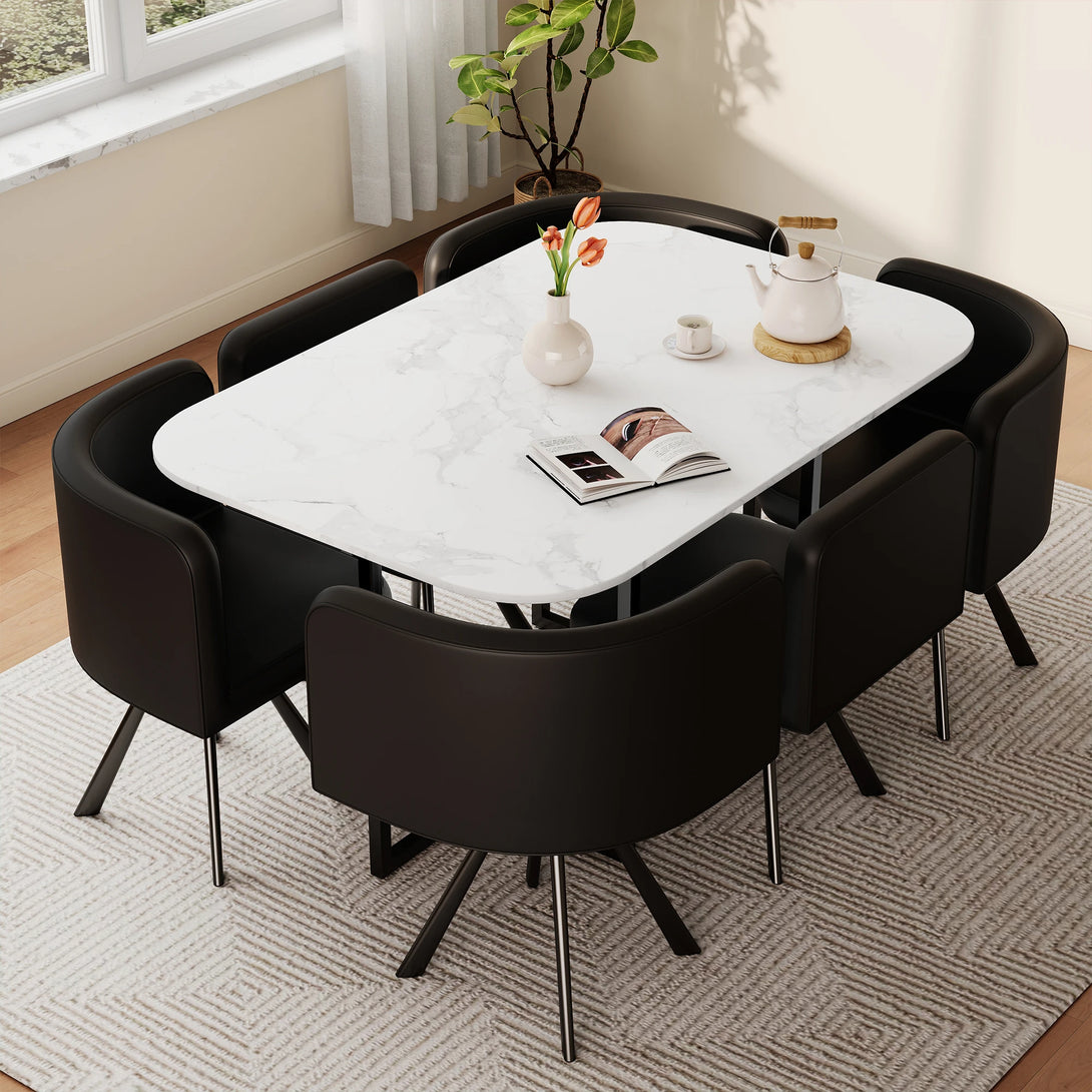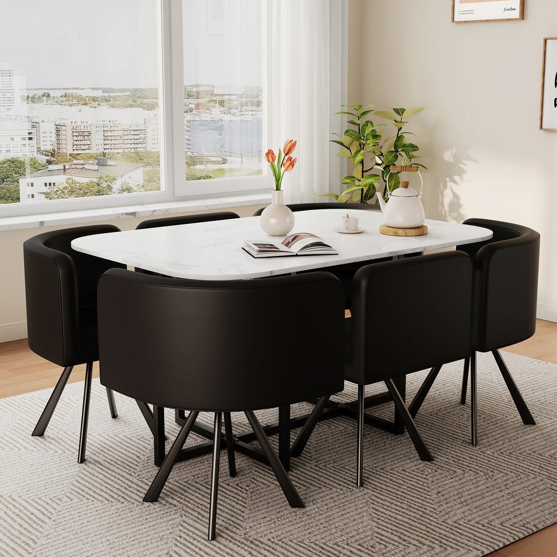 The 7-piece dining set features an MDF table with a printed white marble top and sturdy black metal base. Six black leatherette chairs (corner: 20.5″L × 22″D × 29″H; middle: 18.9″L × 17″D × 29″H) provide comfort and modern style. Table