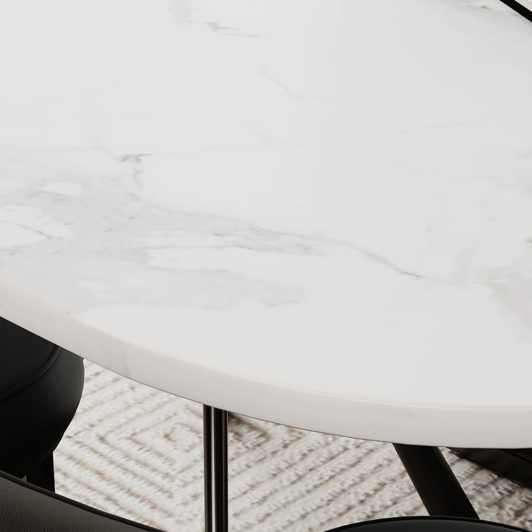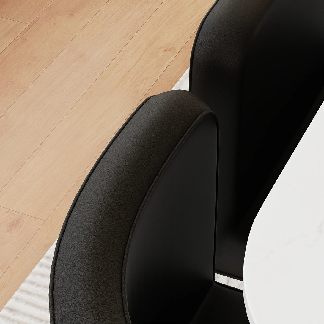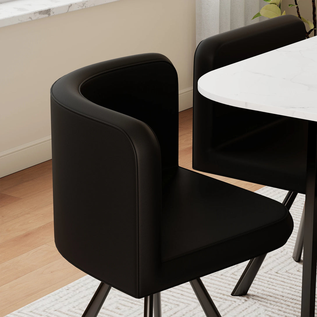 The 7-piece dining set features an MDF table with a printed white marble top and sturdy black metal base. Six black leatherette chairs (corner: 20.5″L × 22″D × 29″H; middle: 18.9″L × 17″D × 29″H) provide comfort and modern style. Table