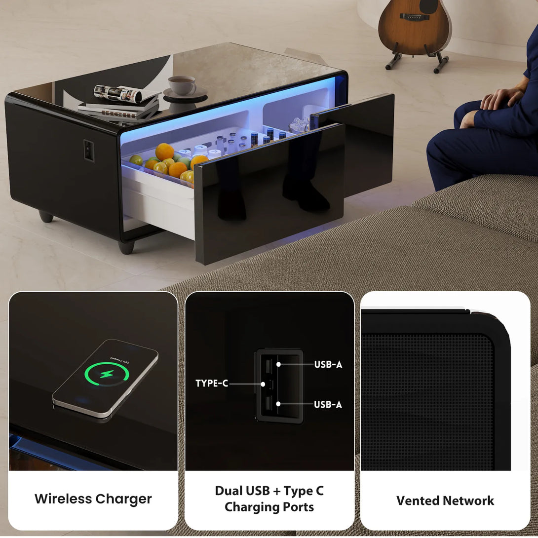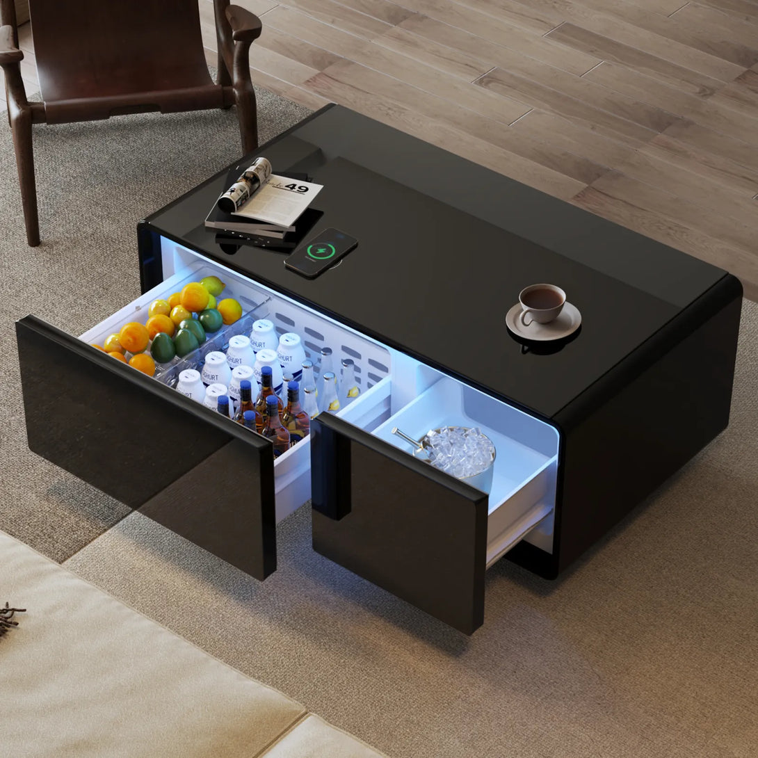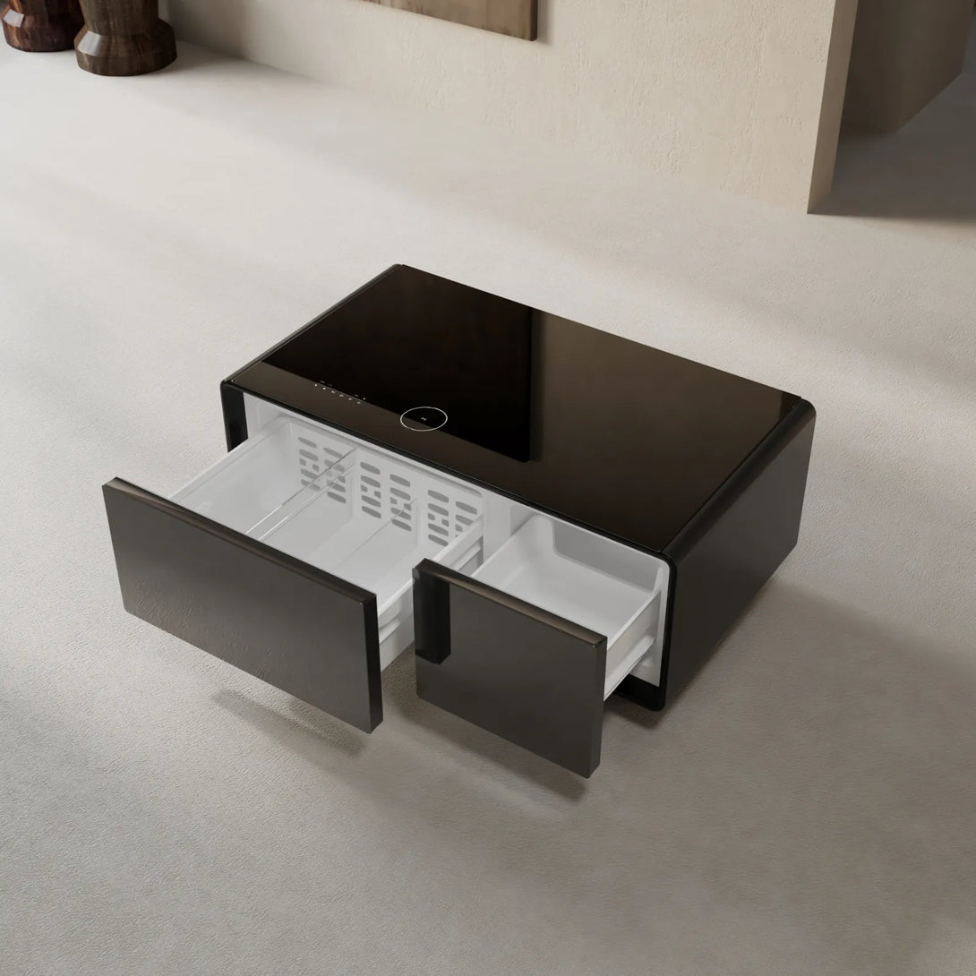 Upgrade your living space with this multifunctional coffee table featuring dual fridge drawers for cooling and freezing. Select models offer wireless charging, power outlets, Bluetooth speaker, and atmospheric lamp for enhanced convenience. With options for touchscreen or mechanical knob controls, plus storage and mobility features, this table perfectly blends technology with style.