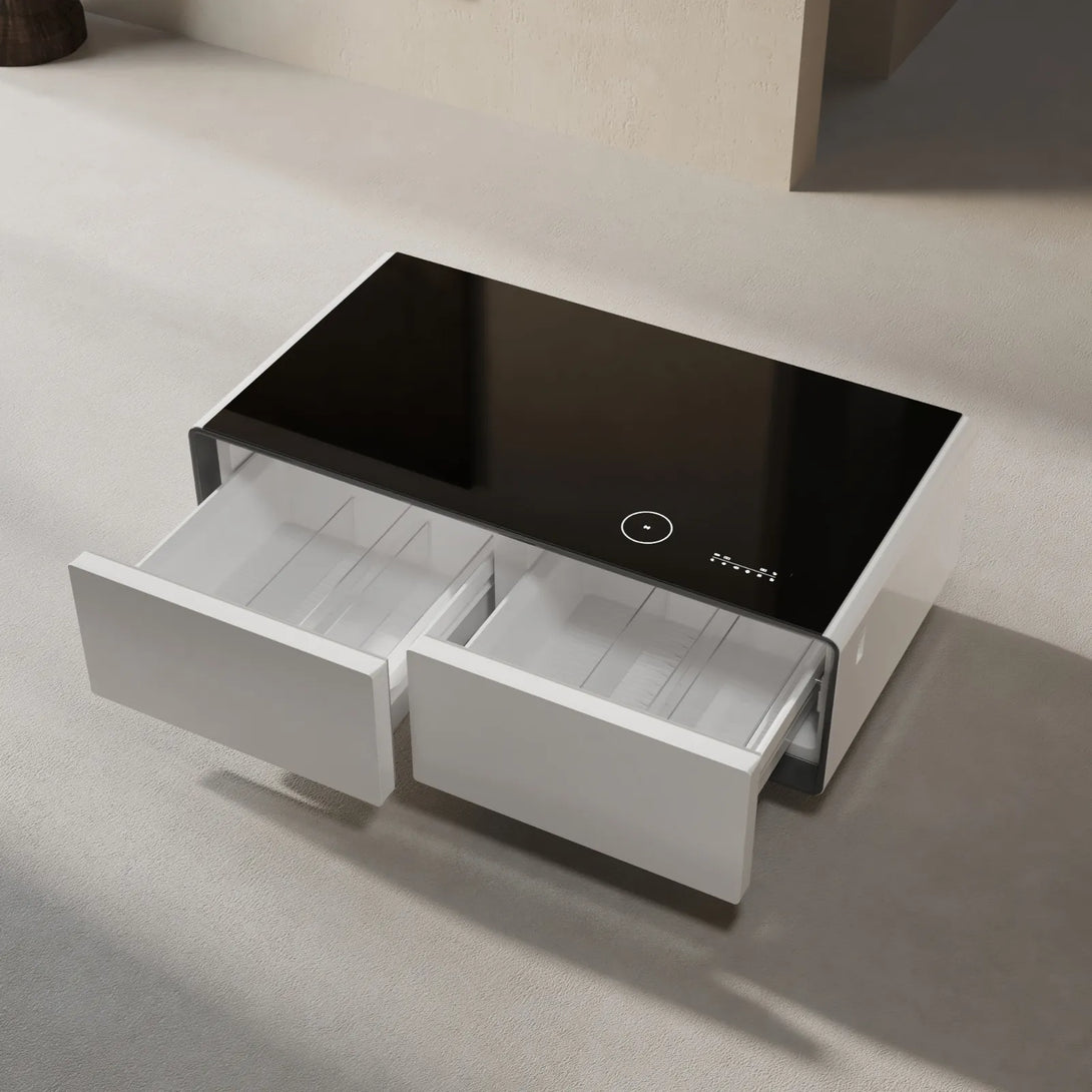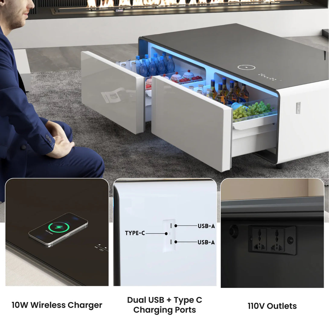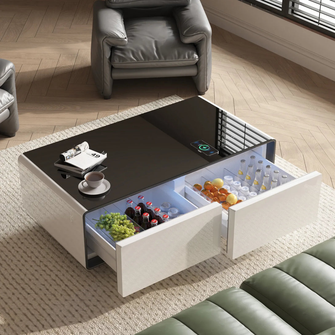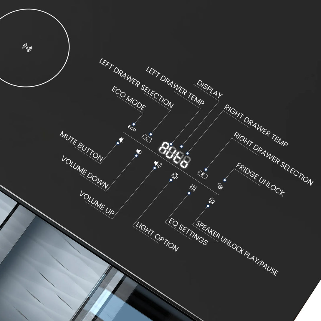 Upgrade your living space with this multifunctional coffee table featuring dual fridge drawers for cooling and freezing. Select models offer wireless charging, power outlets, Bluetooth speaker, and atmospheric lamp for enhanced convenience. With options for touchscreen or mechanical knob controls, plus storage and mobility features, this table perfectly blends technology with style.