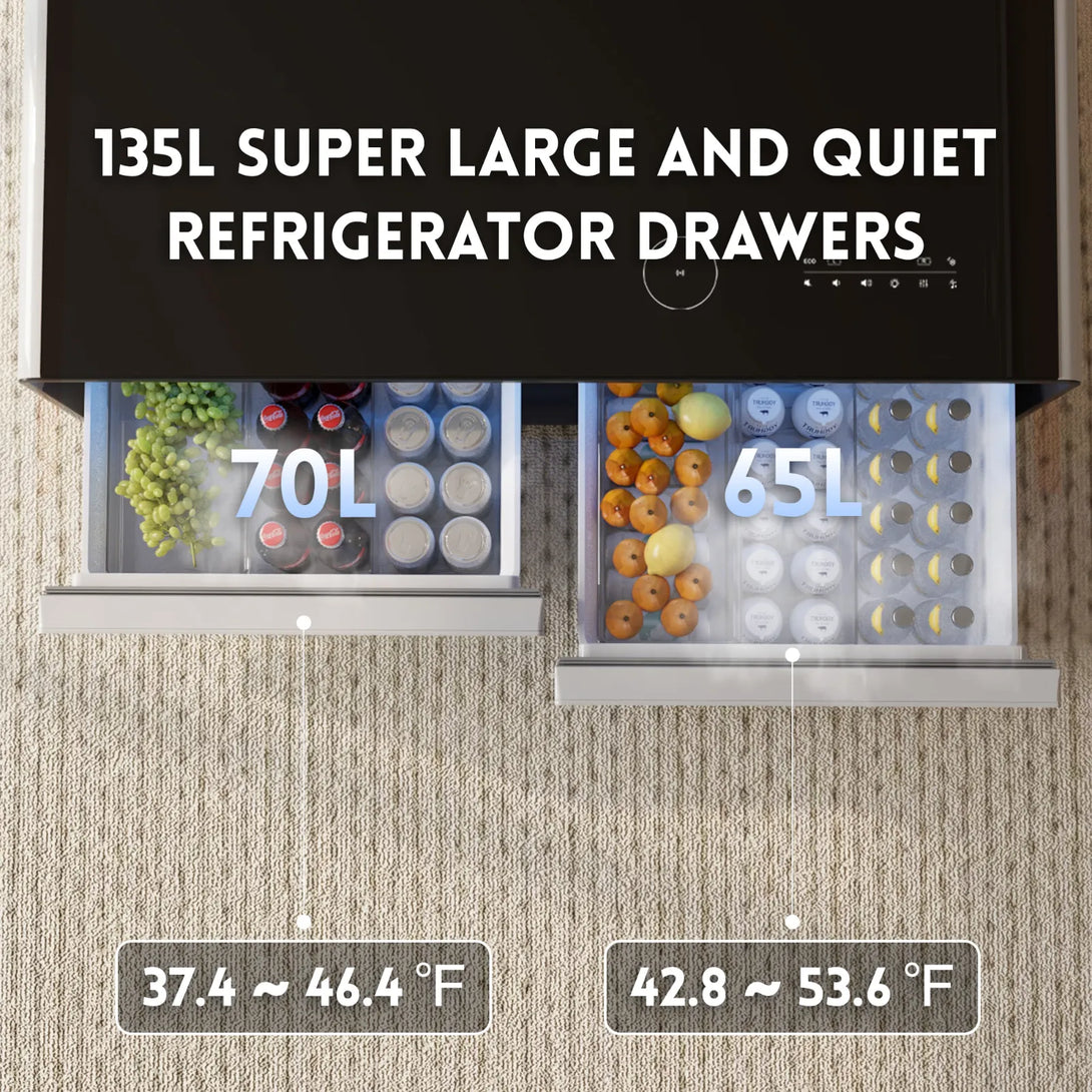 Features: Cooling/freezing drawers, wireless charging, power outlets, speaker & lamp (select models), touchscreen/mechanical knobs