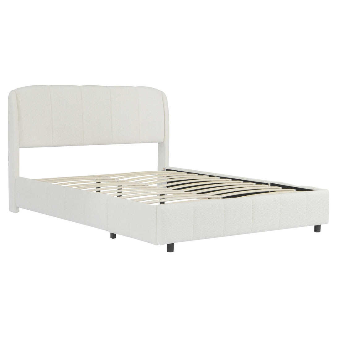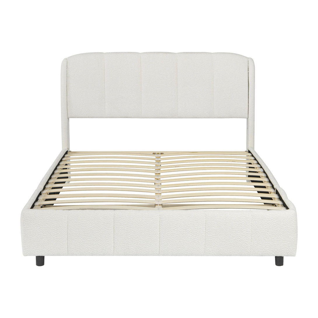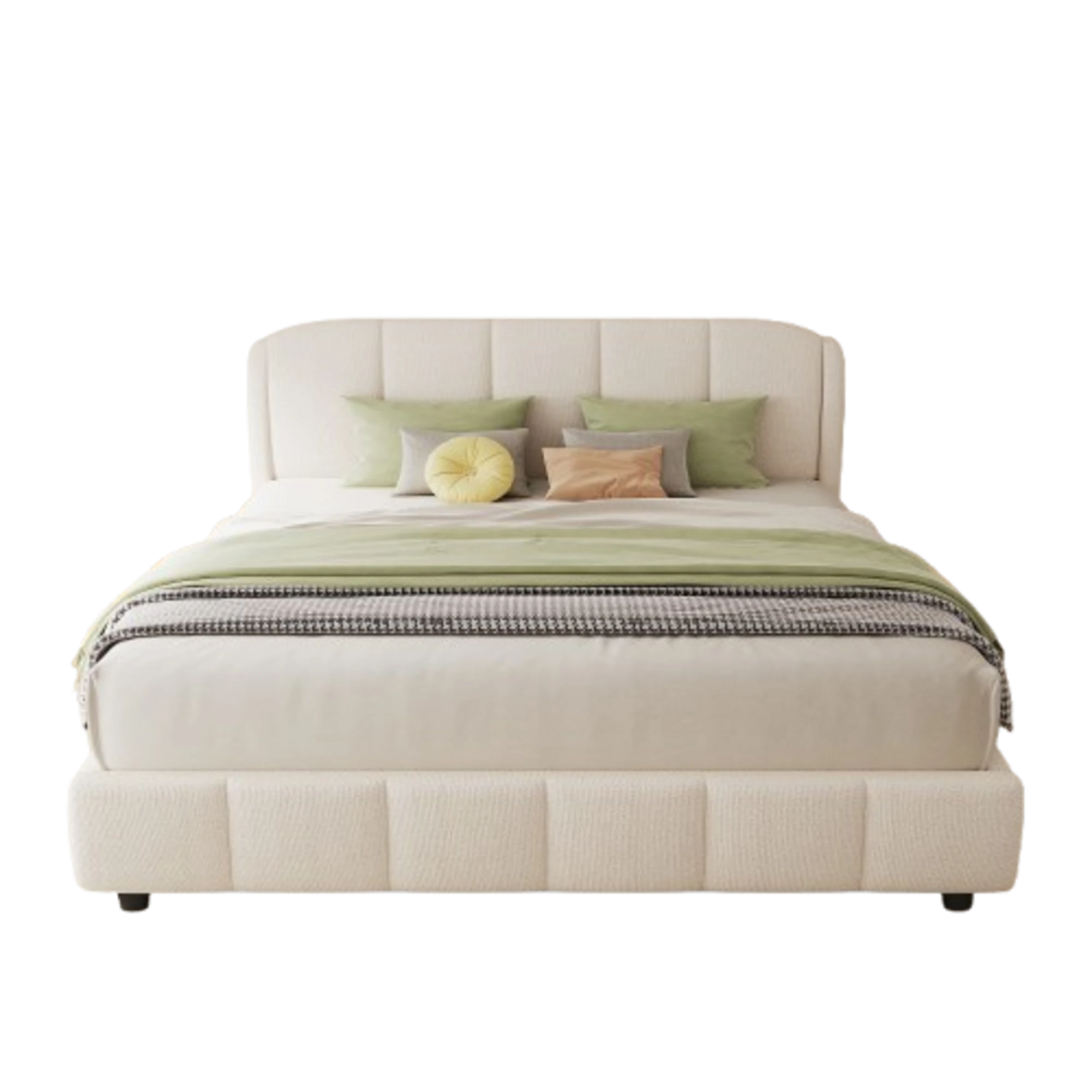 Transform your bedroom with this elegant queen-sized platform bed, featuring a rounded headboard upholstered in premium boucle fabric. Its soft curves and plush texture add sophistication and comfort to any space. Crafted with a sturdy frame and durable legs, it ensures long-lasting stability and restful sleep. Conveniently shipped in one box, this bed assembles in just 30 minutes with two adults. Stylish, durable, and easy to set up—your perfect bedroom upgrade.