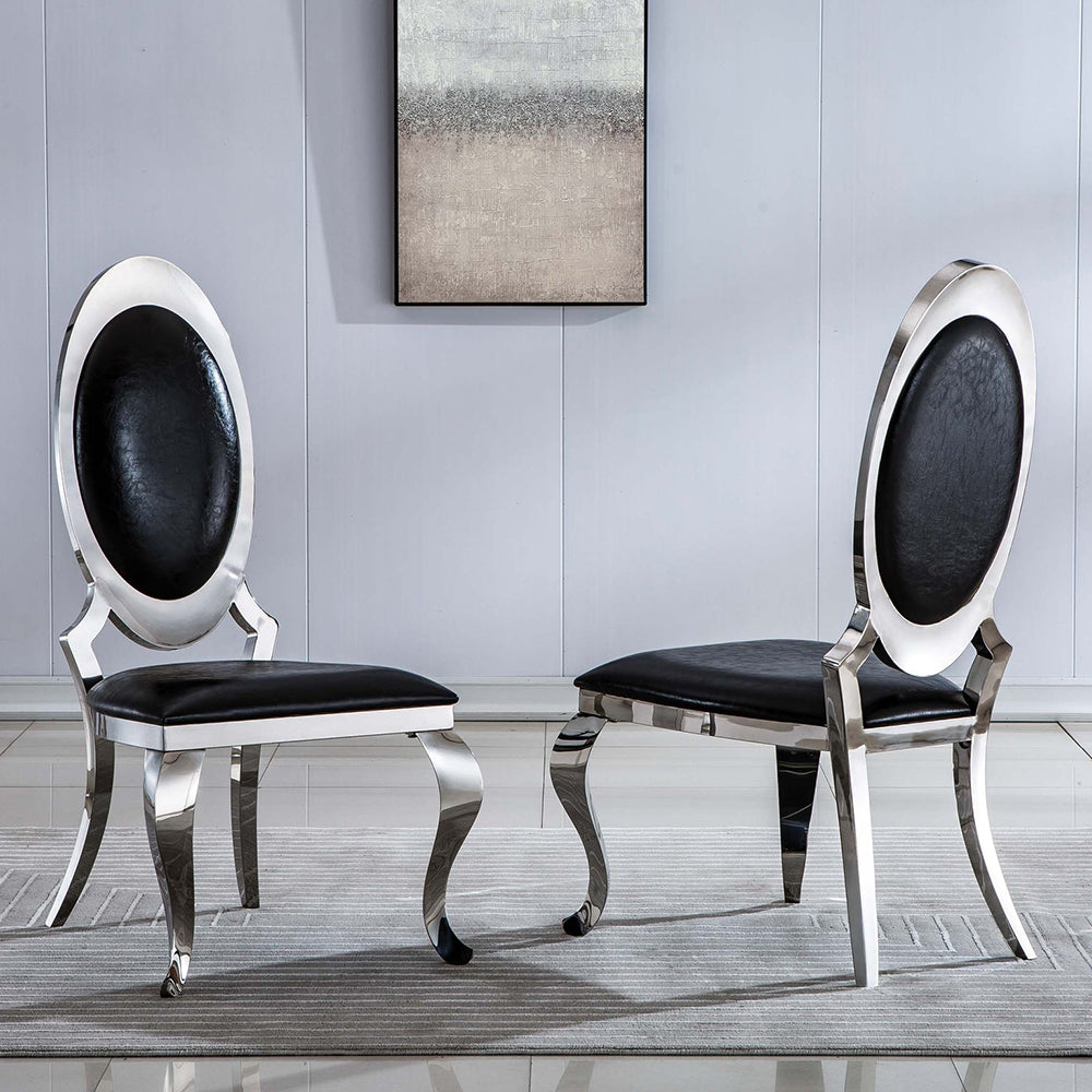 This dining chair combines elegance and modern design with a black leather upholstered seat and backrest for superior comfort. The sleek gold-colored metal frame adds a contemporary flair, blending classic and modern styles seamlessly. Ideal for dining rooms, it enhances the space with a sophisticated and inviting atmosphere. The refined structure and luxurious materials make it both a functional and stylish addition to any home.