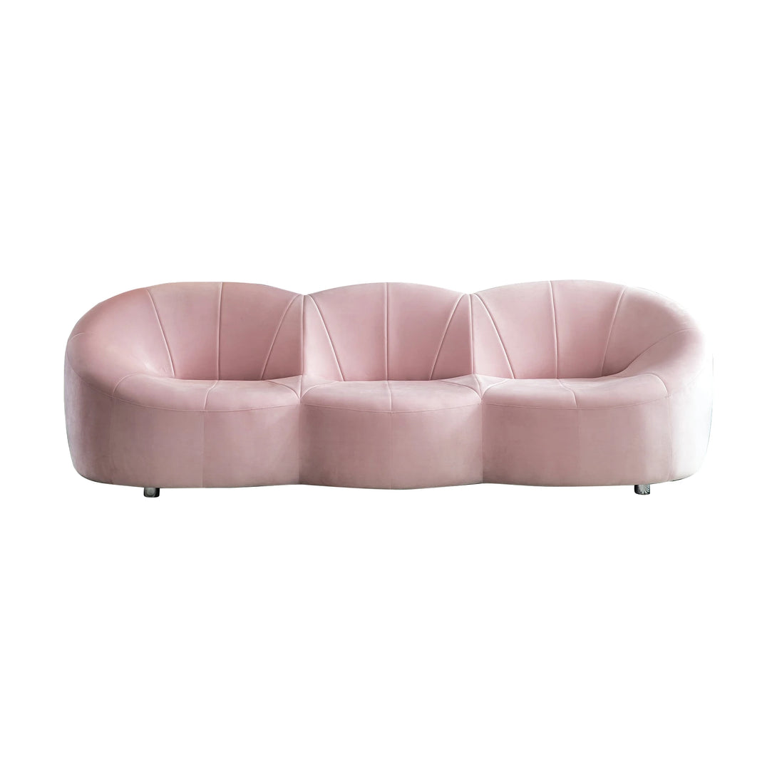 Luxurious pink velvet sofa designed with a modern curved silhouette to bring elegance and comfort to your living space. Upholstered in soft 100% polyester velvet with plush high-density foam cushions and supported by a sturdy solid wood structure, this generously sized piece offers both style and durability. Arrives fully assembled for immediate enjoyment.