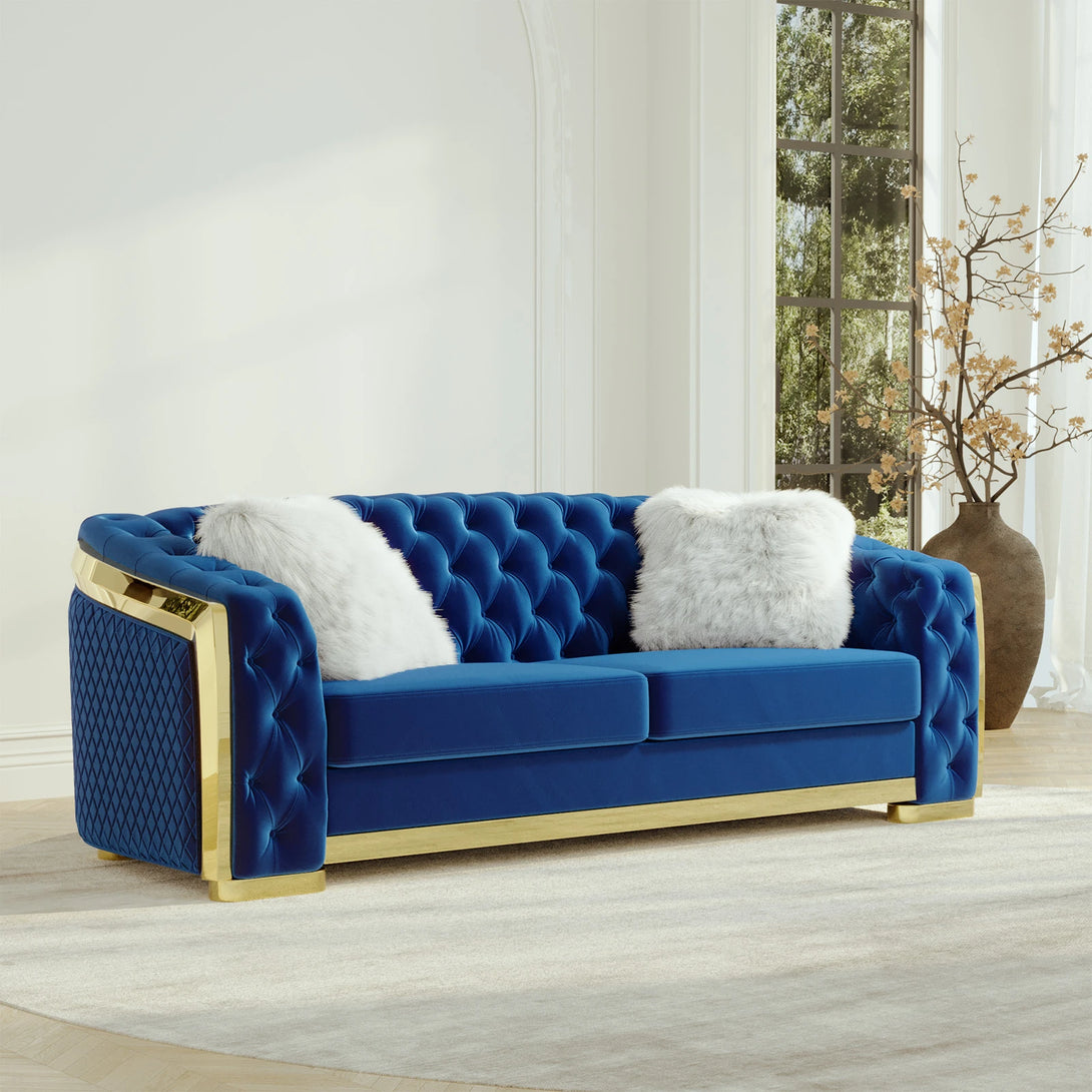 Opulent velvet sofa featuring plush 100% polyester upholstery, sleek stainless steel legs, and a durable solid wood frame. Designed for both comfort and style, it brings a sophisticated touch to any living space.