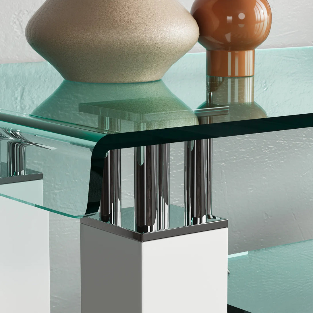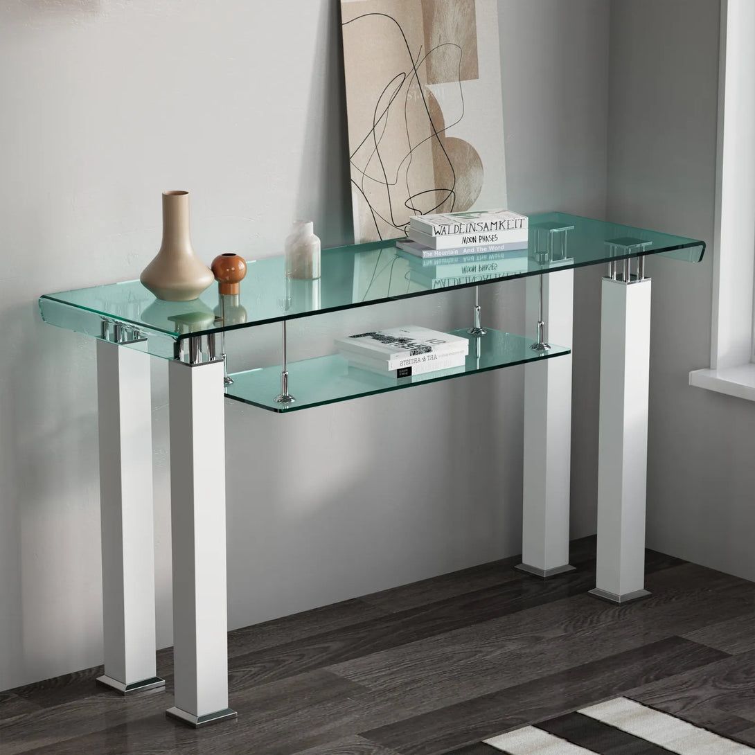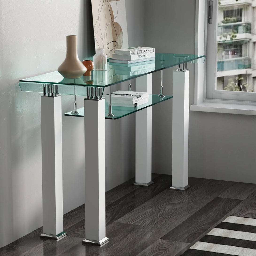 Elevate your home with this modern console table featuring a 10mm tempered glass top and an 8mm inner glass layer for enhanced durability. The sleek leatherette finish in black, white, or grey complements a variety of décors, while the sturdy metal frame ensures stability. Perfect for entryways or living rooms, its spacious yet slim profile offers both style and practicality.