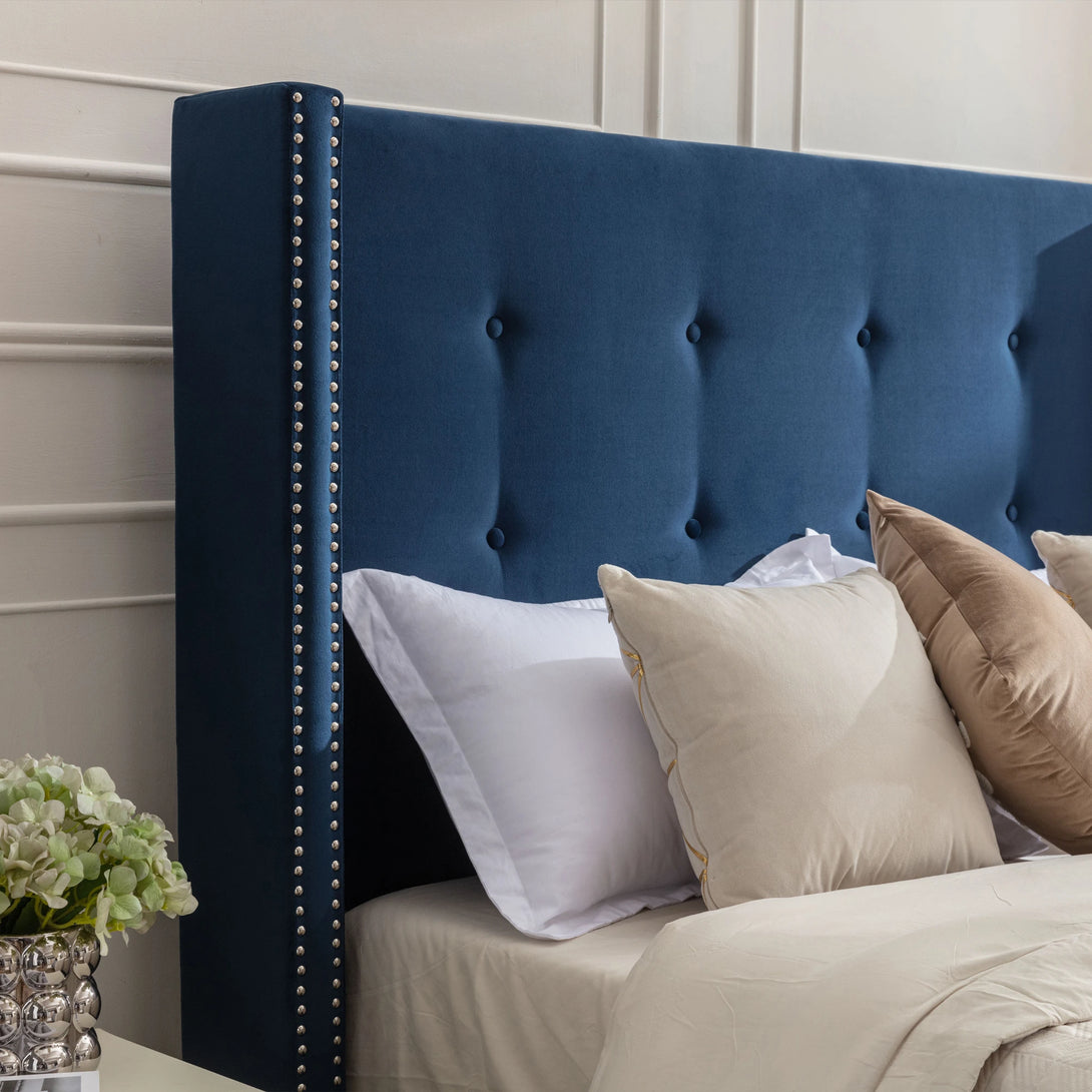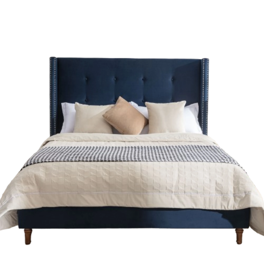 Elevate your bedroom with this elegant bed frame featuring a 54” tall tufted wingback headboard with nail-head trim. Solid wood feet in walnut finish and a reinforced metal frame provide timeless style and reliable strength. No box spring required—durable wooden slats support up to 1000 lbs. Quick 30-minute assembly with included tools and video guide. Ships in one secure box.