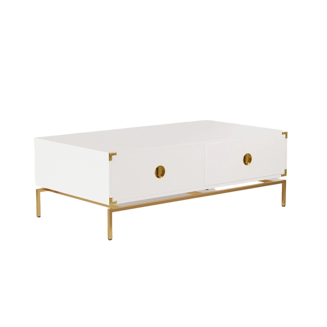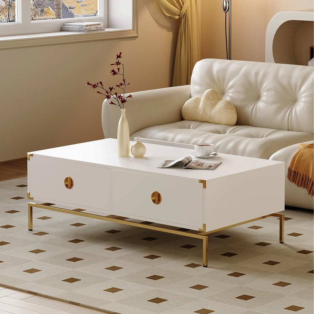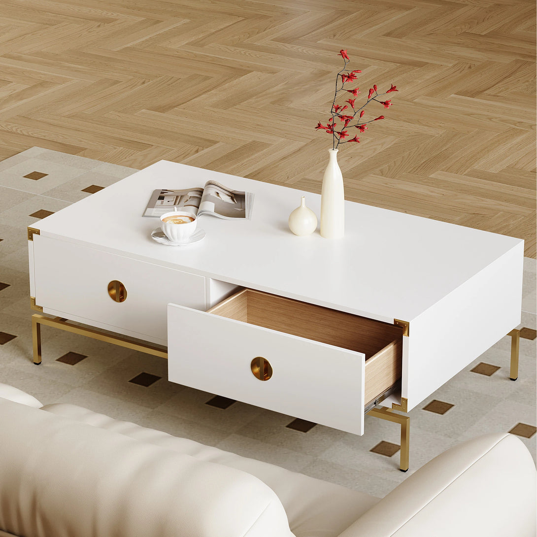 with wood frame, white lacquer top, and gold metal legs. Features two drawers for extra storage. Stylish and sturdy, perfect for living rooms, bedrooms, or offices. Easy to clean with a soft cloth; check leg stability regularly.
