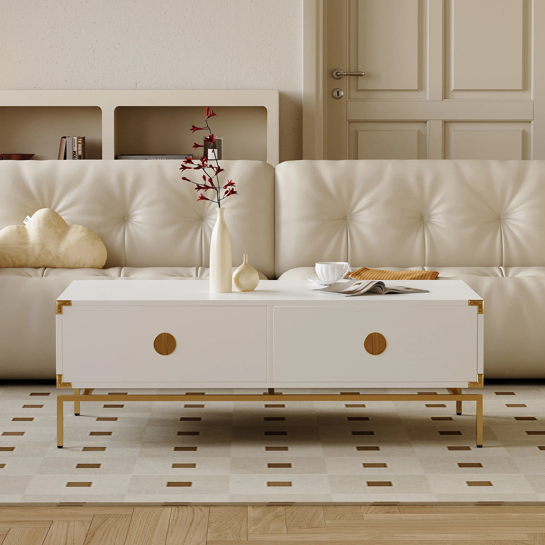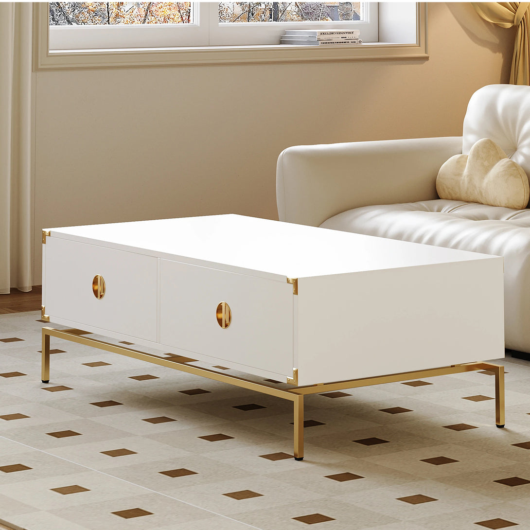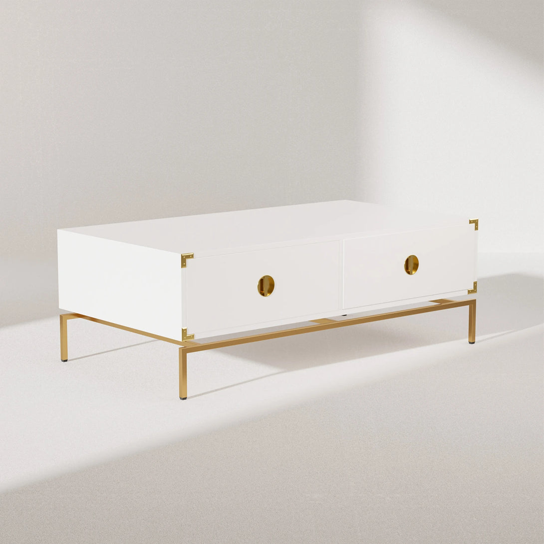 with wood frame, white lacquer top, and gold metal legs. Features two drawers for extra storage. Stylish and sturdy, perfect for living rooms, bedrooms, or offices. Easy to clean with a soft cloth; check leg stability regularly.
