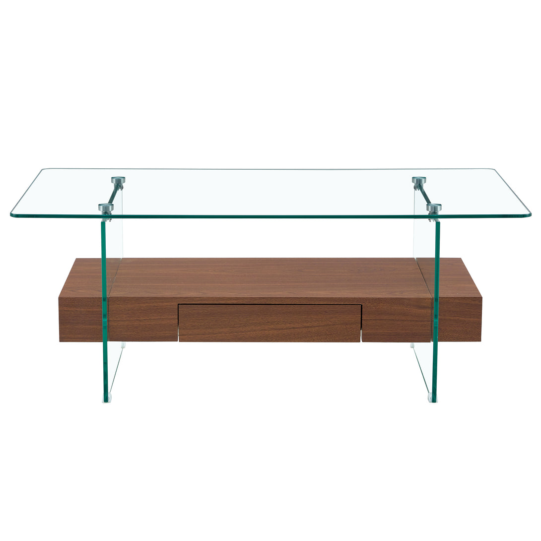 This modern coffee table features a tempered glass top, wood-look MDF base, and a spacious drawer for storage. Sturdy glass legs ensure stability, while its compact size (43.3" L) fits any living space. Easy to assemble (15-20 mins) and available in multiple colors.