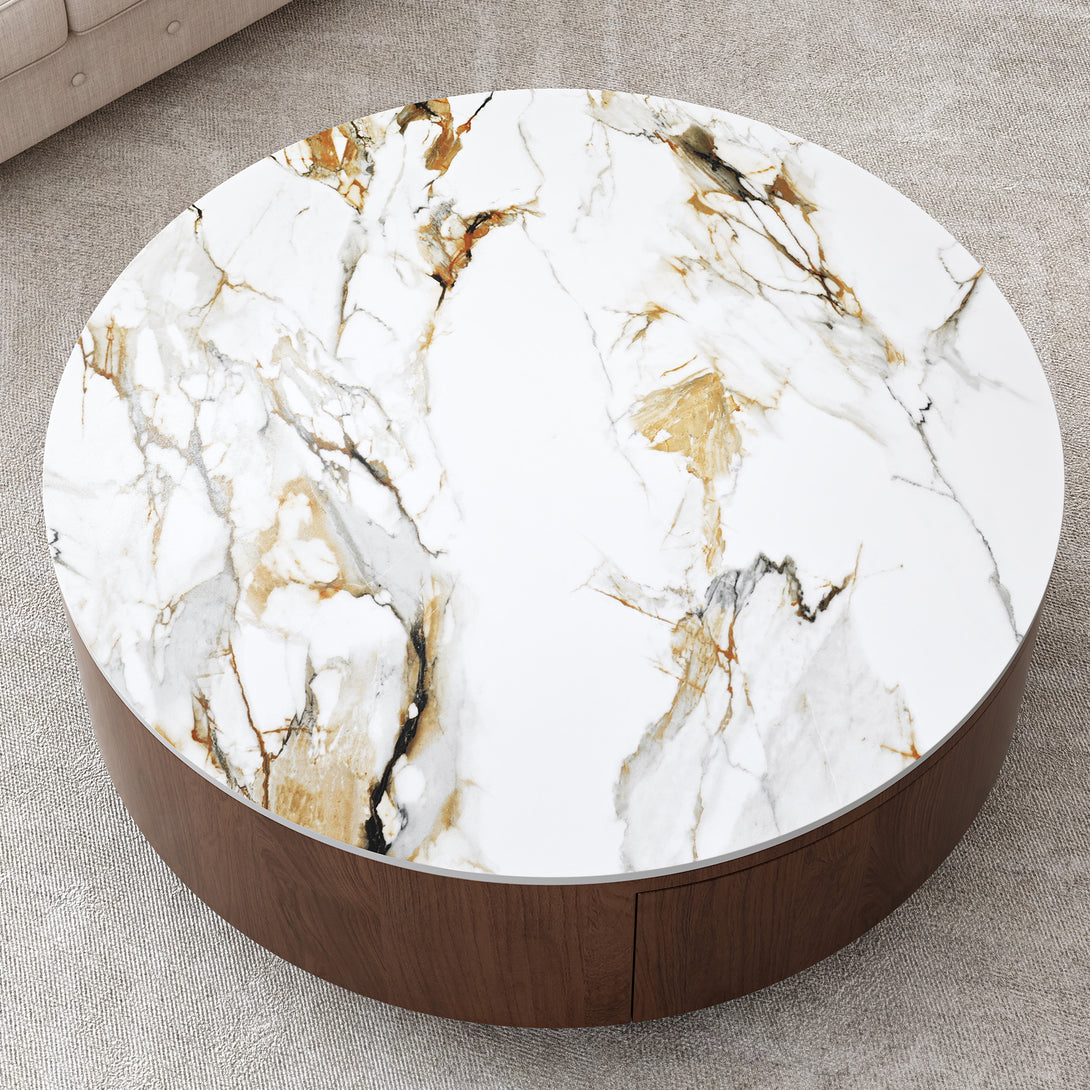 Heat-resistant sintered stone top with Gold Nero marble finish, walnut veneer base, and stainless steel legs. Features two soft-close drawers—perfect for modern living rooms. Combines elegance with durability.
