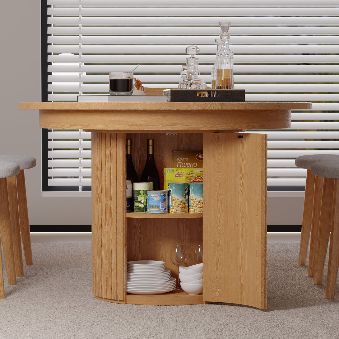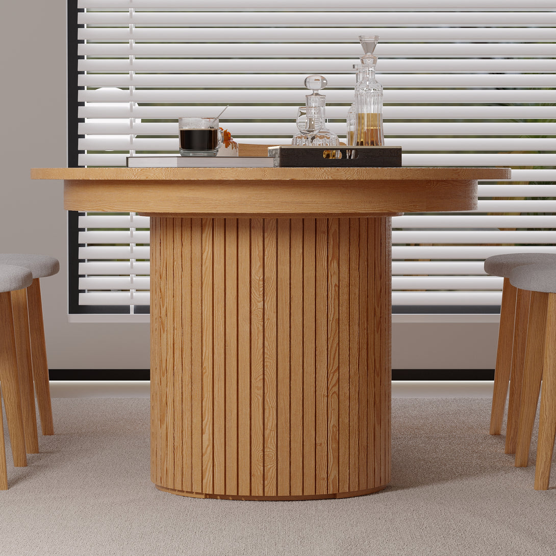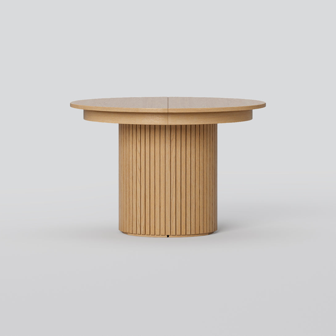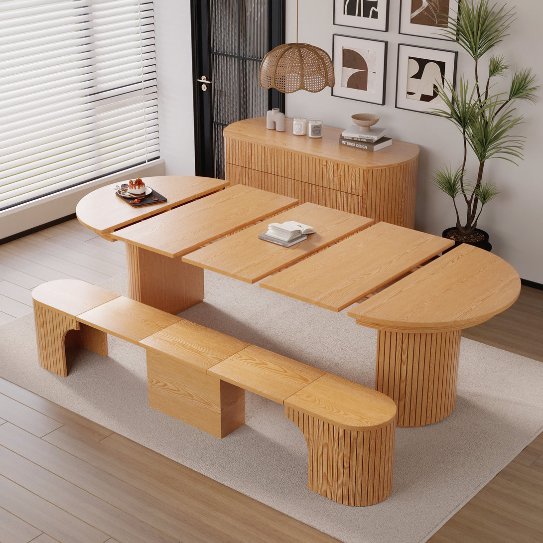 This modern dining table features a transformable round-to-oval design, allowing you to easily expand the table with three extension panels — perfect for everyday meals or hosting up to 10 guests. Crafted from engineered hardwood with oak veneer and solid wood slats, each tabletop showcases natural wood grain variations unique to every piece.