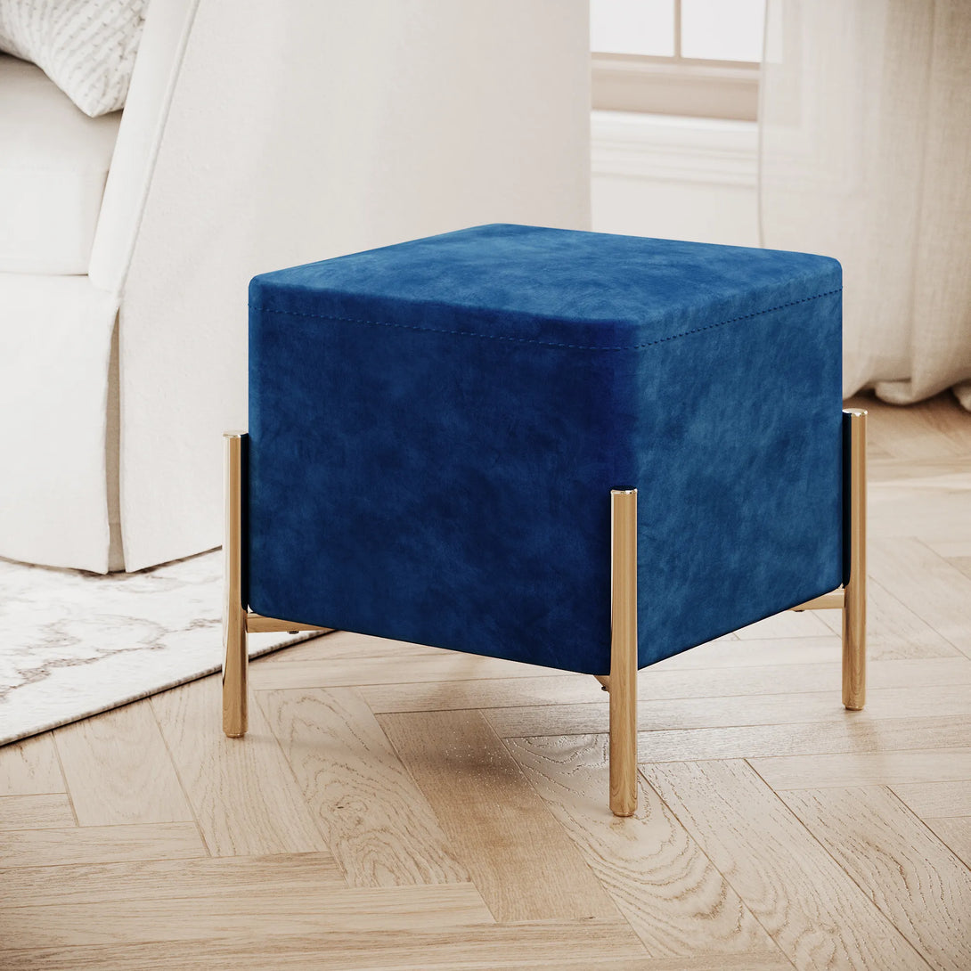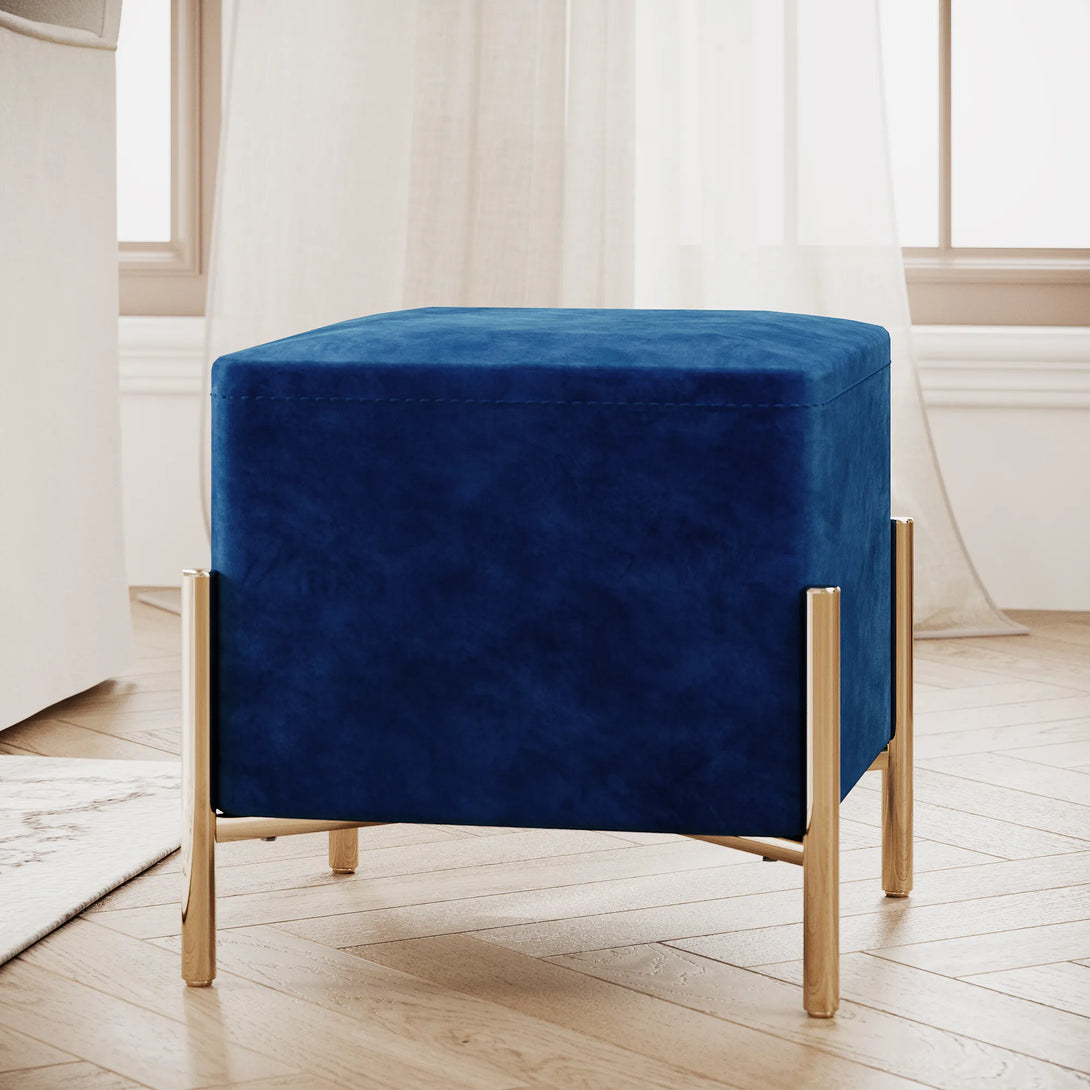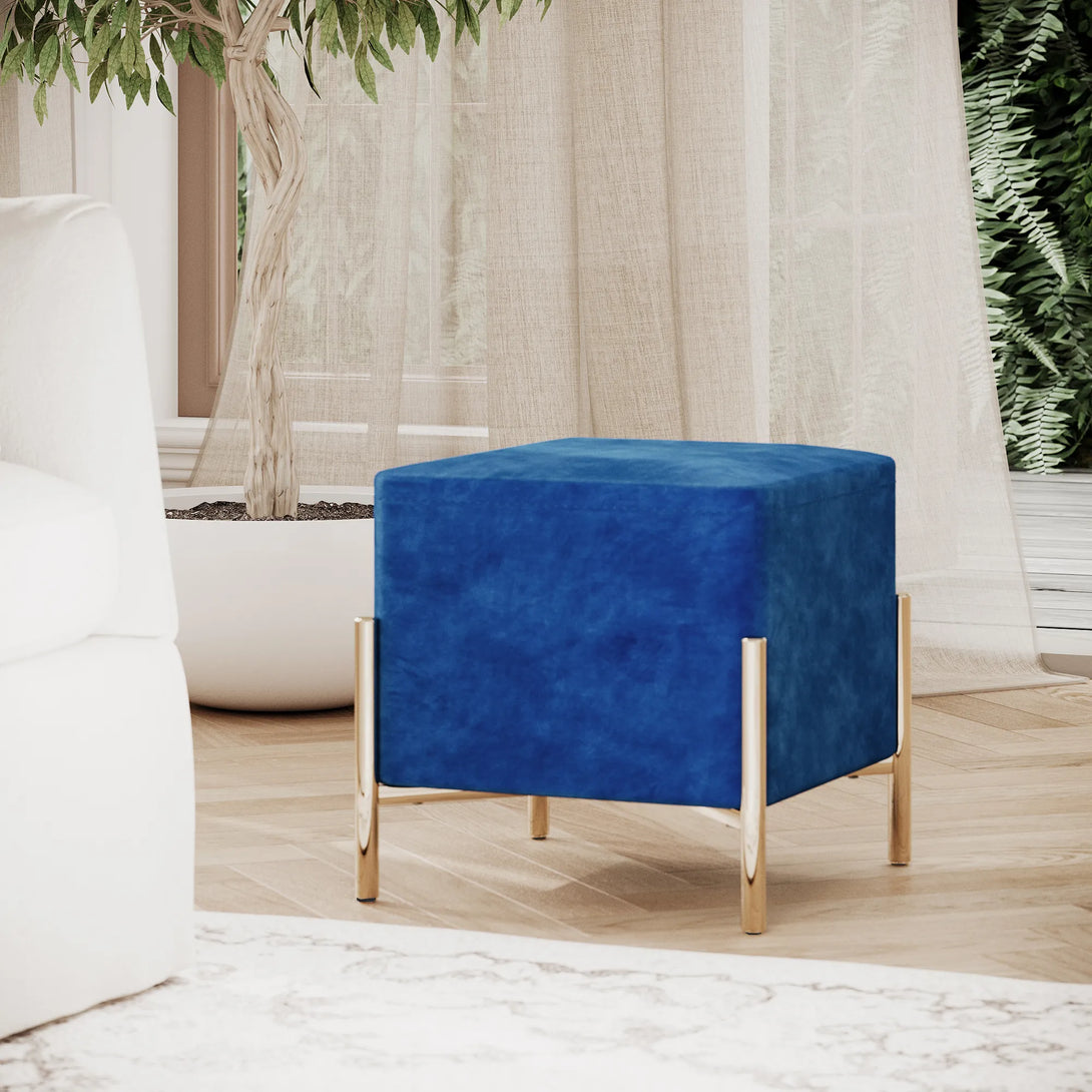 Add a touch of sophistication with this square velvet ottoman, available in blue, grey, or pink. Featuring luxurious velvet upholstery and glamorous gold stainless steel legs, it serves as a versatile piece for use as a footrest, extra seating, or an accent table. Its compact design makes it perfect for small spaces, while sturdy construction ensures long-lasting durability. Assembly required.