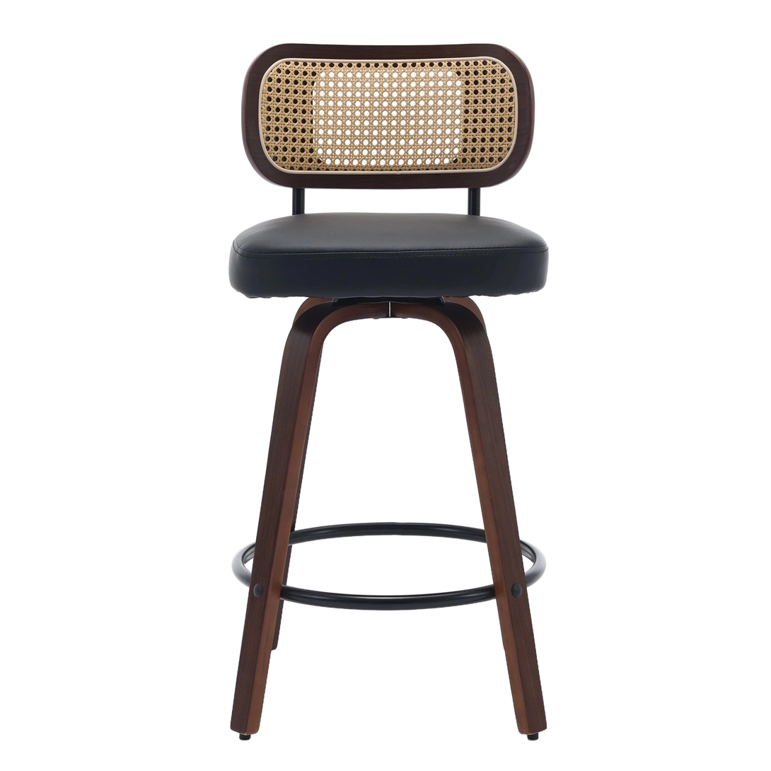 Enhance your kitchen or bar with this stylish swivel stool, combining PU leather upholstery, rattan cane back, and walnut wood legs. Designed with foam filling for comfort, its 360° swivel and breathable backrest offer both practicality and charm. Perfect for kitchen islands, bars, or dining spaces, this stool brings rustic elegance with modern functionality.