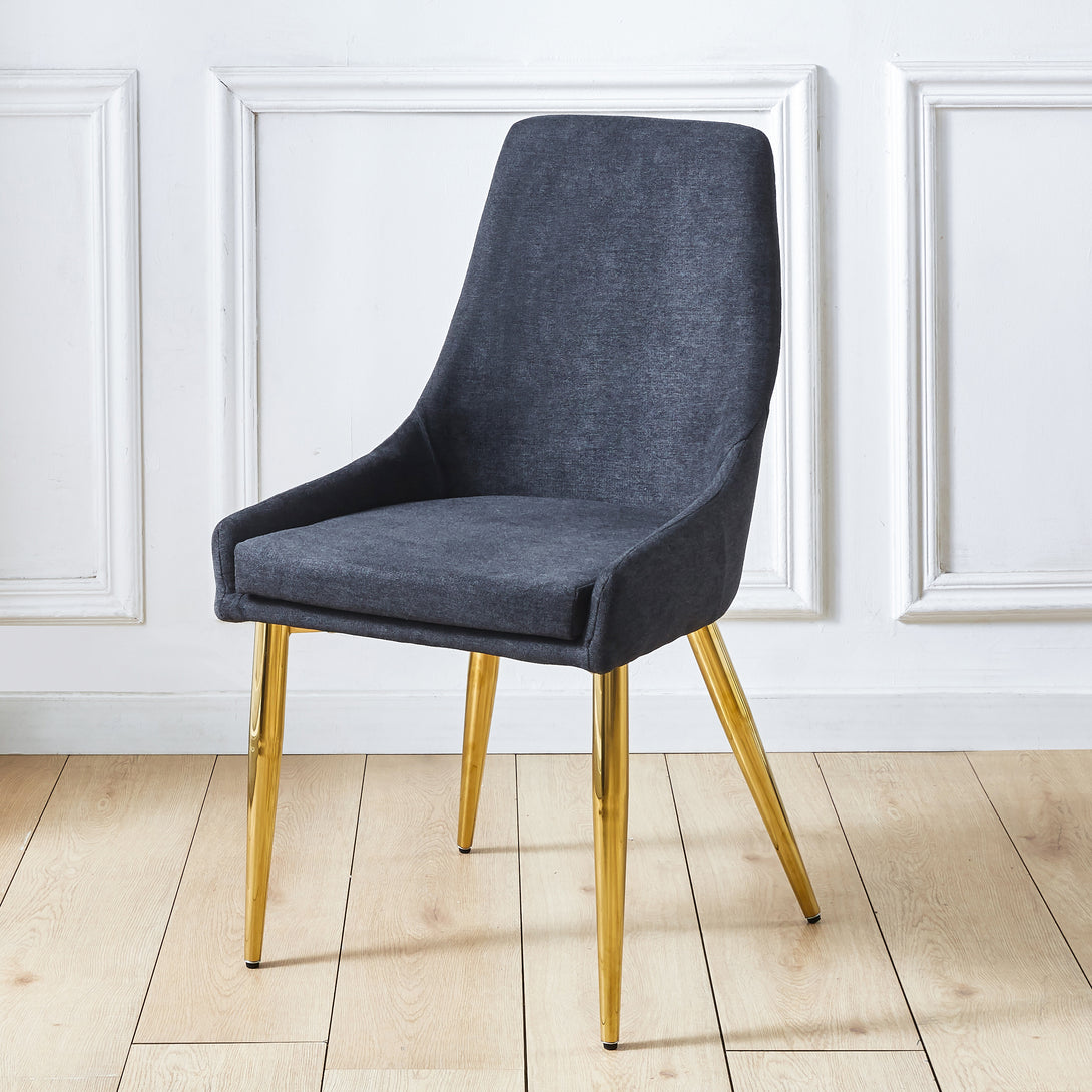 This modern chair combines comfort and style with a sleek black fabric seat and sturdy metal legs. The fabric offers a plush seating experience, while the metallic sheen adds a fashionable touch. Perfect for dining rooms, offices, or living spaces, its durable design ensures long-lasting use. Easy to maintain—simply wipe with a soft cloth.