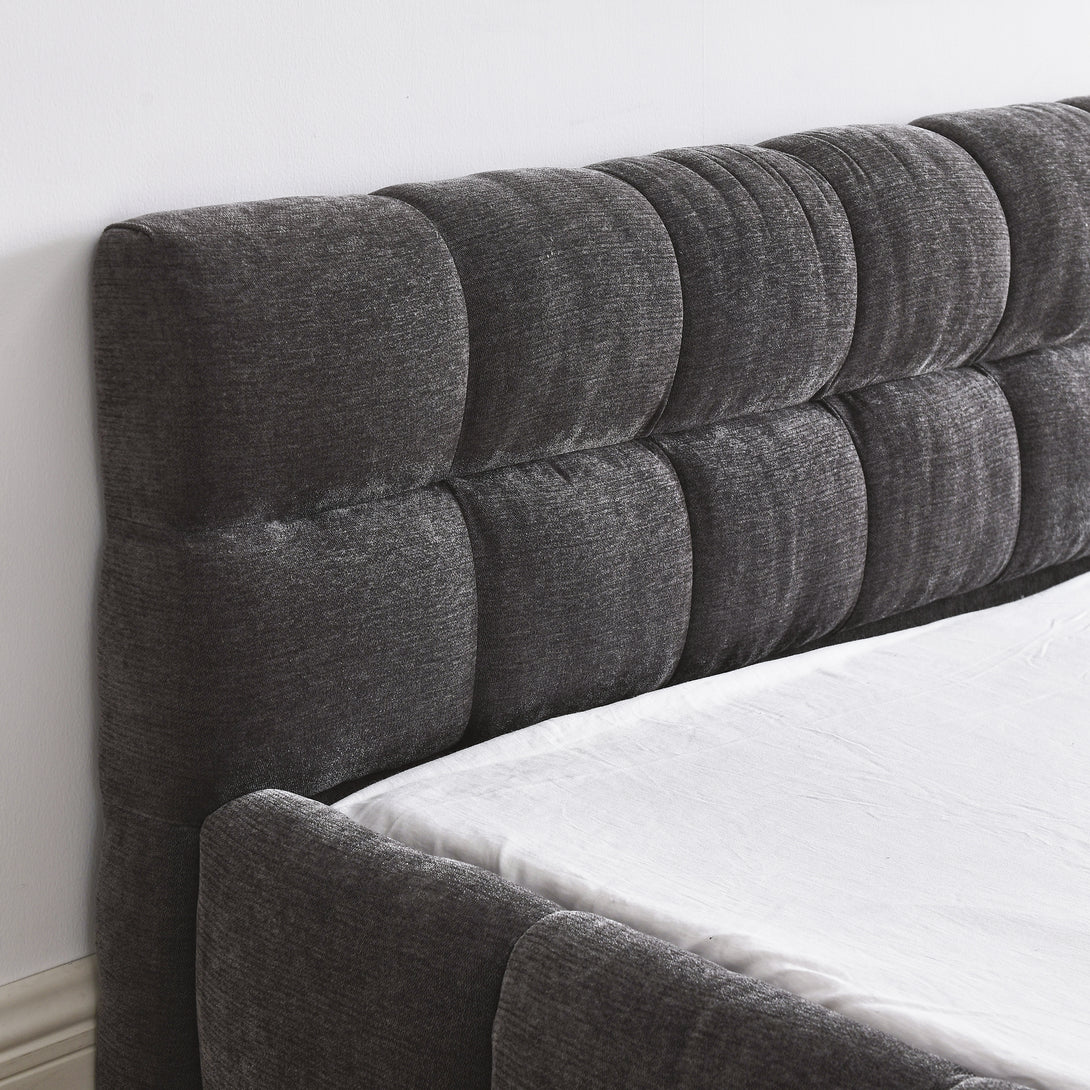 Queen size grounded platform bed in dark grey chenille fabric, with thick padded headboard. Solid eucalyptus composite frame provides sturdy support, modern and elegant design, no box spring required.