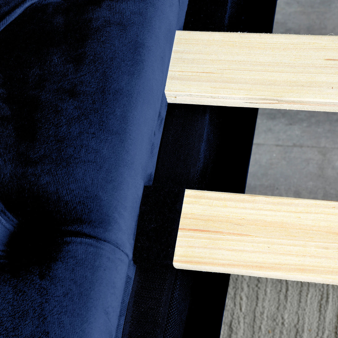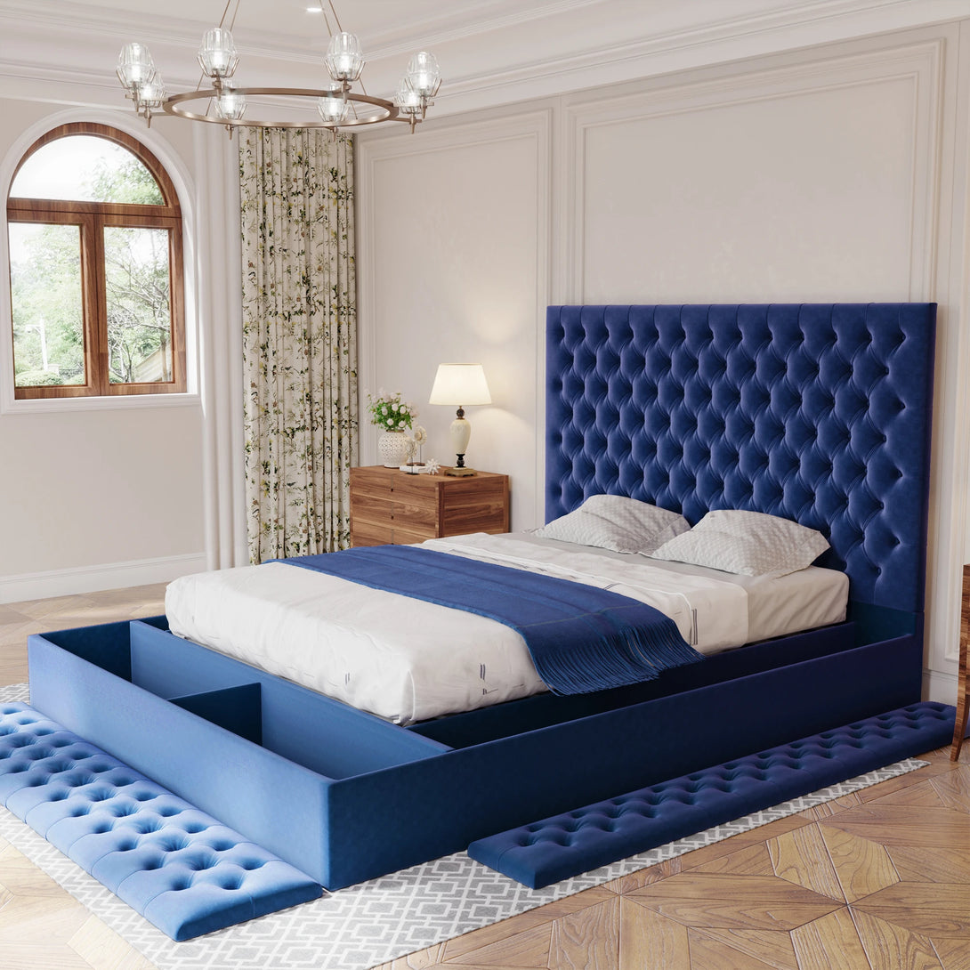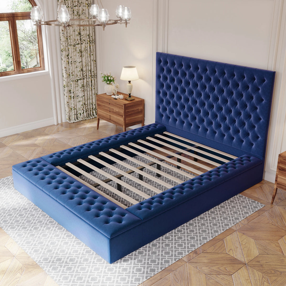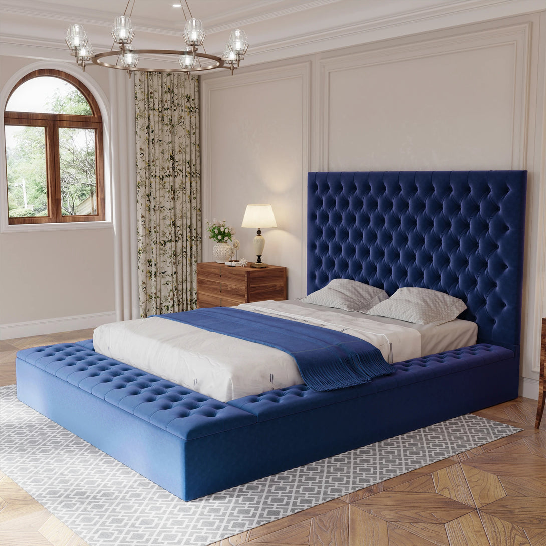 Crafted with a sturdy frame and upholstered in high-quality blue velvet, this bed is filled with high-density sponge for comfort. The tufted headboard and footboard enhance aesthetics and support, making it ideal for master bedrooms, guest rooms, or hotels.