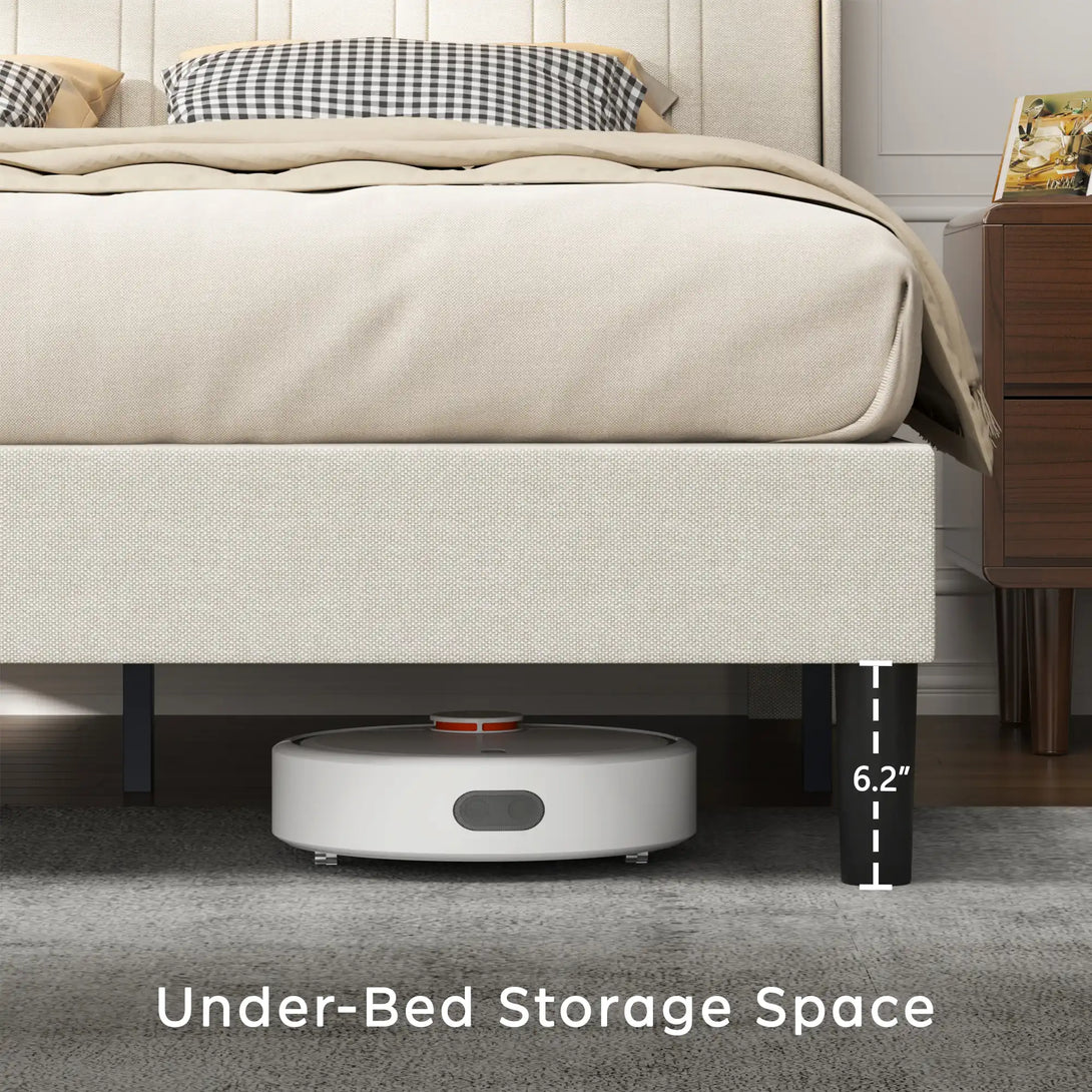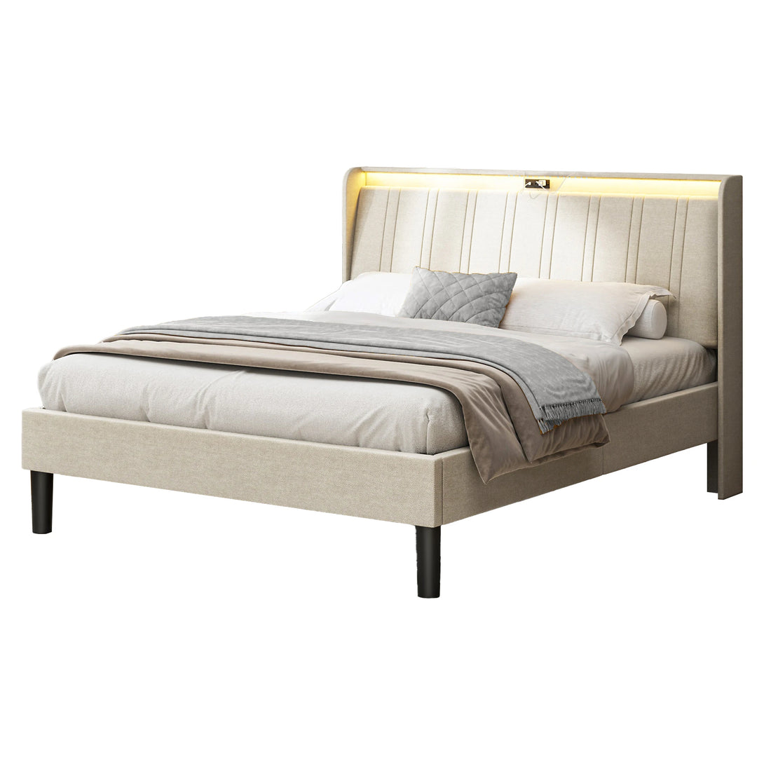Modern queen-size upholstered platform bed in grey velvet with LED-lit headboard, dual-height adjustment, and four spacious drawers. Built with sturdy metal frame, solid wood slats, and reinforced legs, it supports up to 800 lbs while offering comfort, storage, and style—no box spring required.