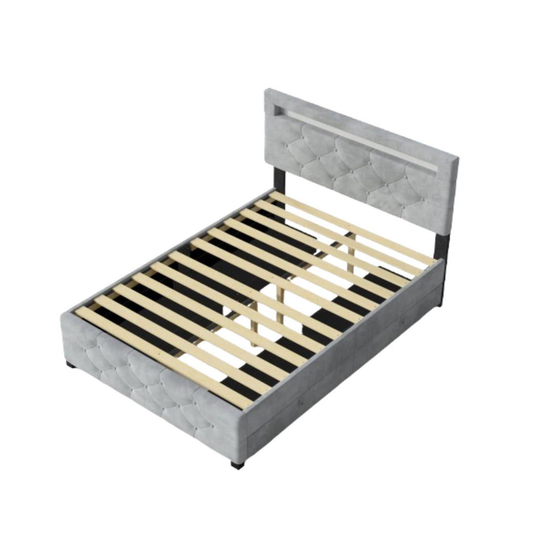 Beige full-size platform bed with velvet-upholstered headboard and sturdy metal frame. Features USB ports, AC outlets, and noise-free EVA mute bar. Supports up to 800 lbs and requires no box spring, blending comfort with modern convenience.